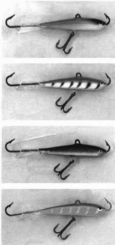 Рис. 14. Окуневые балансиры:а) фирмы «Nils Master»; б) самодельный (поролоновая «рыбка» на джиг. головке) Горизонтальные приманки, которые при сбросе падают почти вертикально, раскачиваясь как маятник, окуня привлекают слабо. Большое количество хваток окуня наблюдается при сбросе приманки. Несмотря на то, что игра балансиров известных фирм привлекает рыбу в момент подъема, матерые горбачи атакуют приманку только во время свободного падения. (А.В. Пышков, С.Г. Смирнов) | |