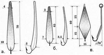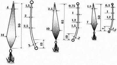 Пролистаешь отдельные статейки сладкоголосых дилетантов о блеснении со льда и диву даешься: все ясно, все просто, сверли лунку и раз... глазам не верится! А что же на самом деле? К сожалению, если отбросить счастливые мгновения первого и последнего льда, то картина может быть безрадостной даже на хорошо знакомых водоемах. Многочасовой поиск при отсутствии клева выматывает видавших виды рыболовов. А что же говорить о начинающих блеснильщиках, которым на первых порах приходится ох как не сладко?! Самое печальное, что на фоне горькой досады и душевного опустошения многие временно теряют веру в собственные силы и навсегда – интерес к блеснению со льда. Сколько раз бывало, чуть отдышавшись после запредельной физической нагрузки, вызванной бесконечным и, как выясняется бесполезным сверлением сотен лунок, рыболов начинает задумываться, в чем же причина его столь явной неудачи, больше похожей на поражение? Причин, скорее всего несколько, но выделим важнейшие: качество блесны и правильное ее преподнесение (приемы ловли и игра приманки). Для начала поговорим о выборе и качестве блесен. Плохие зимние блесны – это наша общая беда, но к этому все настолько привыкли, что уже считают, что так и должно быть. Просматривая рыболовную литературу последних десяти лет, создается впечатление, что зимние блесны, да и вообще блеснение со льда – это так, ерунда, что-то несерьезное! Вот спиннинговая тема (не важно какая) – это да, есть о чем поговорить! Хотя видно невооруженным взглядом, что значительная часть предлагаемых приманок и специфических приемов ловли в России вообще никого не интересует и навсегда останутся экзотикой и украшением, элементом повышения рейтингов рыболовных журналов. Если в ловле так называемой мирной рыбы у большинства любителей снасти доведены практически до совершенства (кивки, мормышки, удочки), и ими успешно пользуются миллионы рыболовов, то в зимней ловле хищных рыб по-прежнему больше вопросов, чем ответов. А самая малоизученная тема – блесны. Поэтому все, что связано с выбором зимних приманок для ловли хищных рыб, выделено в отдельную главу. Блесны для ловли в стоячей воде и на слабом течении (глубина до 5–7 м)Лет тридцать – сорок назад у большинства приманок было название по фамилии ее изобретателя и, как правило, изготовителя, например, блесны Власова, Семенова, Бабурина и т.д. У каждой блесны присутствовал свой неповторимый почерк. Блесны были доведены до совершенства. Отличительная деталь хороших блесен – правильно подобранная форма, сложнейшая и тщательно выверенная геометрия профиля, то есть точно рассчитанная толщина по длине приманки (рис. 1). Рис. 1. Вариации на тему блесны Власова За счет этого блесна обладает уникальной, стабильной, интересующей хищника игрой при разных скоростях подъема и сброса, а также при свободном падении. Рыболов с такими приманками способен подобрать ключик к «несговорчивому» хищнику практически на любом водоеме и в любое время года. Но подавляющее большинство зимних блесен такими возможностями игры не обладает, они рассчитаны на выполнение одного максимум двух приемов ловли, при которых и должна произойти хватка (рис. 2). Блеснить, конечно, ими вы можете в любом темпе и с разной амплитудой, но пользы от этого будет мало. Более того, неумелые действия рыболова способны не только отпугну