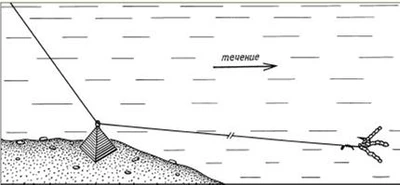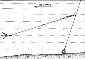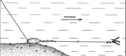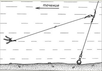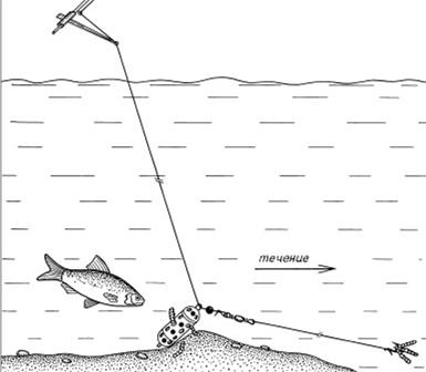 Рис. 3. Комбинированная оснастка с кормушкой При глухой оснастке обычного «телескопа» длина лески, как правило, равна длине удилища или чуть меньше: применяя короткую леску, крайне трудно вываживать крупную рыбу. Приноровившись, правда, в процессе борьбы с рыбой можно складывать колена. При пользовании удилищем, оборудованным пропускными кольцами, катушкой и соответствующим кивком, иногда лучше выпустить после подсекания метр-два лески для удобного вываживания. Но при ловле в корягах этого делать не стоит, а лучше взять оснастку покрепче и напористо вываживать рыбу, не давая ей большой свободы движений. Поскольку кусты осенью просматриваются, нужно иметь одежду защитного цвета, чтобы она сливалась с общим береговым фоном. (А.Г. Горяйнов) | |