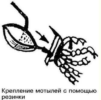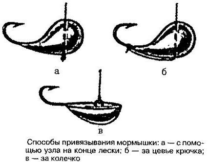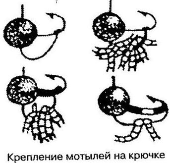 Из детского надувного шарика или напальчника вырезать полоску длиной 8—10 мм и шириной 1 мм, которую одним концом накалывают на острие крючка. На водоеме, прежде чем опустить мормышку в лунку, на поддев ее крючка, надо уложить несколько мотылей, натянуть резинку и наколоть на крючок уже другим концом.