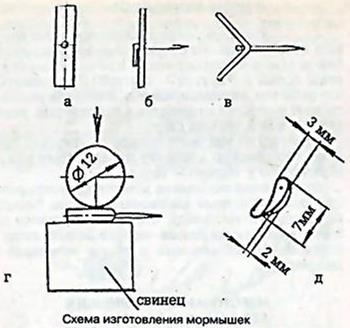 Дальнейшую обработку заготовки производят на свинцовом брусочке. Изгиба мормышки необходимого радиуса можно добиться с помощью стальной палочки диаметром 12 мм (см. рис., позиция г). Когда тело мормышки готово, в нем иглой (отступая от верхнего конца мормышки) пробивают вертикальное отверстие для пропуска лески. Иглу с прочным основанием по возможности укорачивают. Отверстие пробивают легким деревянным молоточком, частыми и несильными ударами. Окончательную обработку мормышки производят иглой (см. рис., позиция д).