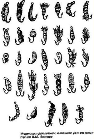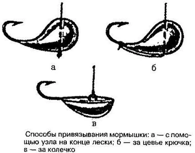 Легкие мормышкиНа небольшой глубине и при благоприятных погодных условиях опытные рыболовы в отличие от новичков неплохо ловят рыбу на мелкие и легкие мормышки. Диаметр их 1,5—2 мм. Некоторые мормышки представляют собой оболочки с припоем из олова, всевозможные пластинки из латуни, меди, больше похожие на миниатюрные блесенки. К легким относят также мормышки из эластичного капрона, пластмассы. Легкая мормышка обеспечивает более деликатную игру. Иногда такая мормышка весьма эффективна в сочетании с более тяжелой мормышкой, привязанной на 15—20 см ниже. Такая оснастка зачастую приносит успех при ловле леща и окуня. Самые мелкие мормышки весят всего 0,1—0,3 г, а самые крупные (для ловли налима, судака) могут достигать 30—35 г. В поисках корма рыбы полагаются на зрение, слух, обоняние, осязание. Они способны отыскать корм не только б прозрачной воде, но и в мутной, днем, в сумерках и ночью. Большую роль здесь, очевидно, играет и боковая линия у рыб, реагирующая на малейшие волновые колебания в толще воды. Вот почему так важна лравдопо-добная имитация движений подводных обитателей. Именно естественное «поведение» приманки обеспечивает ее уловистость. В рыболовной литературе иногда можно встретить утверждение, что форма мормышки не играет существенной роли. С этим согласиться нельзя: от формы приманки зависит характер ее движений. Способы крепления мотылейРыба предпочитает живых подвижных мотылей. Для этого любители придумали много способов, чтобы не прокалывать личинок, а закреплять их на крючке пучками при помощи резиновых колечек, нитками, полосками резинок от детского надувного шарика. Вот один из способов крепления мотылей на крючке. Мотыли прижимаются к цевью леской, как показано на рисунке. Подробного описания тут не требуется, но необходимо знать, что отверстие на цевье крючка поплавочной удочки и в мормышке должно быть таким, чтобы леска в нем перемещалась с некоторым усилием и надежно удерживала наживку. Когда на крючке «кембрик» (оболочка радиотехнического провода), на нем закрепляется не пучок, а всего пара или даже один мотыль. «Кембрик» можно сделать из колечек оболочки в различном сочетании цветов. Такой способ наживления крючка годится и летом, и зимой. Мотыля лучше собирать в пучки при помощи квадратика бумаги и тонкой капроновой нити, например из старого женского чулка. На клочок бумаги укладываются одна к другой 6—8 личинок так, чтобы их головки и части тела выглядывали наружу. Бумага сворачивается в трубочку. Затем к ней следует привязать нить, придерживая ее пальцем левой руки, а правой рукой из длинного конца ниточки сделать петельку. Петелька нахлестывается на мотылей поближе к краю бумаги и слегка затягивается. Потом петелька повторяется. Концы нити связываются и обрезаются у самого узелка. Заготовку «пучков» можно сделать накануне рыбалки, вечером. Пучок следует закрепить на крючке удочки, поддевая за нить. В приготовлении пучка мотылей поможет гусиное перо. С него аккуратно лезвием срезается опахало, на толстом конце стержня делается срез под углом 30—40 градусов. Внутри накладывается с десяток мотылей. С другой, тонкой, стороны стержня натягиваются колечки из велосипедного ниппеля (до 40 штук). Теперь остается приблизить колечко к срезу пера и осторожно опустить. Колечко плотно обхватит пучок мотылей. Для 