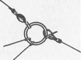 Рис. 2 Опустив снасть на воду, раз за разом подергивают и отпускают буксирную леску, а отбойная речная струя или ветер, если дело происходит на озере, постепенно уводят водяной змей — и приманку в том числе — от рыболова к стрежню реки, на простор плеса. Ход регулируется (в зависимости от течения) длиной хвостового шнурка. Этот шнурок не должен наглухо соединяться с центральным кольцом, иначе вываживанию попавшейся рыбы помешает сопротивление воды. А разъемным его делают, использовав петлю из легкой проволоки или бельевую прищепку. Можно центральное кольцо сделать по типу заводного и закладывать хвостовой шнурок между витками кольца. При резкой подсечке хвостовой шнурок отделится от центрального кольца, водяной змей развернется и легко направится в сторону рыболова (рис. 2). (Н.П. Фетинов) | |