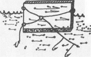 Рис. 1 Оснащают кораблик по-разному. Поводок из более тонкой, чем буксирная, лески привязывают к заднему колечку или, немного отступив, два-три поводка непосредственно к леске, идущей к рыболову. Длина поводков неодинакова. В теплую пору, например, при ловле на насекомых язя, голавля, они не превышают 30–40 см, а осенней порой, когда рыбы скатываются в глубину, поводки удлиняют настолько, чтобы приманка — личинки насекомых, выползки, живцы — находилась вблизи дна.
