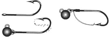 Рис. 7. Прямой крючок на свободной оснастке. Обычный крючок может находиться в равновесии только жалом вниз, но такое положение неудобно — зацепов не оберешься. Разве что можно поставить незацепляющийся одинарник с петелькой, но практика показывает, что так хищник хуже засекается и чаще сходит (рис. 7в). Заставить крючок идти жалом вверх можно, изогнув его в ушке, чтобы точка крепления оказалась выше центра тяжести (рис. 8а). Но такая оснастка (рис. 8б) при забросах будет часто цепляться за лесу, поэтому применяется довольно редко, лишь в специальном незацепляющемся варианте (рис. 8в).