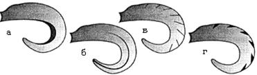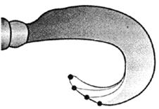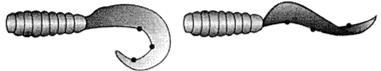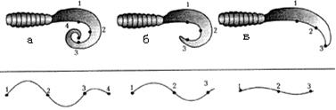 Рис. 2. Строение хвоста твистера и его влияние на игру: У твистера на джиг-головке играет только хвост, поэтому на его строение и нужно обратить основное внимание. Само же тело неподвижно, а его длина должна быть такой, чтобы крючок вывести в задней трети. Длинное тело можно обрезать спереди, короткое — в крайнем случае насадить не до конца. Но хвостик всегда должен оставаться свободным. Форма хвостика — запятой, а конкретно — его конфигурация и толщина оказывают основное влияние на игру приманки. На рис. 2б изображен стандартный твистер, а рядом — его более и менее “загнутые” собратья. Чтобы примерно понять, как будет играть ваш твистер, положите его вогнутой частью на плоскую поверхность и аккуратно растяните. Выпрямившийся хвостик изогнется в виде некоторой волны. Сравнив различные варианты, можно уже сделать первые выводы, а именно: 1. Чем больше хвост закручен внутрь, тем больше перегибов он дает при игре. Причем точки перегибов определяются конкретными точками на хвосте твистера. 2. Чем толще хвост, тем медленнее и размашистее получаются колебания при проводке. А тонкий и мягкий “вьется” у самой оси, почти не разбрасываясь в стороны. Кстати, некоторые модели имеют не округлую, а более выраженную “угловатую” геометрию хвоста согласно точкам перегиба (рис. 3).
