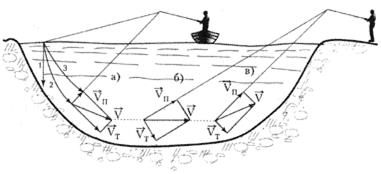 Рис. 11. Движение приманки при различных видах подмотки: Рассмотрим сначала проводку на спуск (рис. 11а). Вот мы забросили приманку. Как она ведет себя дальше? Если леска свободна, то приманка опускается отвесно вниз (линия 1). Если леска застопорена, то приманка падает вперед — вниз уже по дуге (линия 2). А если в это время подматывать леску, то дуга получится более пологой (линия 3). Таким образом в принципе можно подобрать любую траекторию проводки. Груз должен быть достаточно тяжелый, но не слишком, чтобы приманка на падении не переставала играть, но при этом опускалась как можно медленнее. Проводка на спуск успешно применяется с лодки при забросе к берегу, часто даже без подмотки лески. Обычная практика ловли судака: находим свал, ставим лодку на глубине и забрасываем к берегу, осуществляя проводку на спуск. Рыба стоит на бровке головой к мели и издалека видит приманку. Но вернемся к рис. 11. Вот груз упал на дно. Плавной потяжкой поднимаем его и начинаем проводку. Как приманка движется в воде? Она одновременно и падает по дуге под действием силы тяжести со скоростью vт, и движется по леске к рыболову со скоростью подмотки Vп. В результате суммирования этих двух движений приманка будет двигаться по направлению и со скоростью V. Как ее обеспечить? Из рис. 11 видно, что для достижения одинаковой скорости V при ловле на спуск скорость подмотки Vn должна быть небольшой, при горизонтальной ловле — средней, при ловле на подъем — ускоренной. Груз при ловле на спуск берем потяжелее, при горизонтальной проводке — средний, на подъем — легкий. Изменение веса груза изменяет и скорость его падения V т, а это влияет на общие скорость и направление движения приманки. Именно поэтому на рыбалке, особенно в незнакомых местах, желательно иметь комплект сменных грузов разного веса. При толстой леске из-за ее сильного торможения в воде приходится брать и более тяжелое грузило. В принципе правильным сочетанием огрузки и подмотки можно добиться любых направления и скорости движения приманки. На практике все это приходит с опытом. Ловля с берега — это почти всегда проводка на подъем. Лишь иногда при дальнем забросе в самое русло или в яму сначала делается горизонтальная проводка, затем — проводка на подъем, Ловля с лодки на озерах и водохранилищах часто связана с облавливанием подводных возвышенностей — “пятачков”, где хищник обычно стоит на бровке головой к меди. Тактика ловли зависит от размера таких мест. Если “пятачок” маленький, то его облавливают со стороны, чтобы не распугать стоящую там рыбу. Здесь могут присутствовать все три вида проводки. Если же его размер соизмерим с дальностью заброса, лучше всего встать в центр и “веером” обловить границы участка. Если же подводная возвышенность велика, то лучше объезжать ее по периметру, забрасывая вперед и в стороны, Неширокое русло проще облавливать, поставив лодку на середину и забрасывая к берегам. Приманка опускается вдоль свалов, где в основном и стоит хищник. (В.П. Андреев) | |