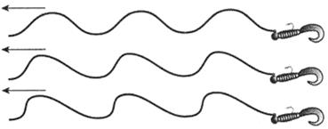 Рис. 10. Разновидности волнистой проводки: Примерно та же картина получается, если просто вращать катушку с короткими задержками, не двигая удилищем. Если мы станем делать паузы более одной секунды при вращении катушки, картина немного изменится — приманка как бы “зависнет” при остановке, а затем “провалится” — плавно скользнет по дуге вперед — вниз, пока мы снова не начнем вращать рукоятку (рис. 10б). Эффект “провала” можно специально усилить, если в момент остановки удилище подать “от себя” (рис. 10в). Тогда на ослабленной леске приманка может опускаться вниз почти отвесно. Эффект в вертикальной плоскости получается самый заметный и энергичный. Но здесь есть существенный недостаток: в момент “отдачи” нарушается контакт с приманкой и можно прозевать поклевку. Вообще третий вариант больше теоретический, чем практический. Лично я стараюсь без надобности не мудрить и использую в основном равномерную проводку с небольшими добавками волнистости, причем не постоянно, а периодически. Дело в том, что хотя скачущие движения приманки и быстрее привлекают внимание хищника, но схватить такую “шуструю” добычу весьма затруднительно. Поэтому здесь много промахов и неверных поклевок, почувствовать которые рыболову сложнее. Кстати, именно при неравномерной проводке встречаются случаи, когда щука “режет” леску даже при наличии металлического поводка длиной 10 — 15 см! Почему? Вероятно, хищник прицеливается в нашу приманку с упреждением, и когда та вдруг останавливается — попадает вперед, в поводок и даже в леску, которая не может противостоять острым зубам. Не исключен и другой вариант: если щука атакует сзади — она просто заглатывает и остановившуюся приманку, и поводок. По крайней мере, у меня однажды небольшой воблер был “выброшен” щукой через жабры и зацепил ее снаружи. Ступенчатая донная проводкаЭто наиболее часто применяемый вариант неравномерной проводки. Принципиальным отличием от волнистой является то, что во время паузы приманка обязательно должна упасть на дно. Ступенчатая донная проводка — основная для судака и часто применяется при ловле окуня, особенно осенью, нередко при такой проводке попадается и щука. Осуществляется донная проводка так: сразу после касания дна делаем три — пять быстрых оборотов катушки и останавливаем подмотку. Приманка по дуге опять падает на дно, поднимая облачко мути. Сразу же следует новый подъем, и снова падение. Именно “на дуге” происходит большинство поклевок. Такая подмотка напоминает либо кормящуюся рыбку, либо бегство пескаря от опасности, которое можно визуально наблюдать летом на мелких местах, где греются эти рыбешки. Напуганные чем-либо пескари делают рывок вперед, поднимая облачко мути, и пытаются затаиться на дне. При ступенчатой проводке есть три основных правила: 1. Постоянный контакт с приманкой. Чтобы легче видеть леску, возьмите хорошо заметную, лучше флуоресцирующую. Кончик удилища можно поднять вверх на 45 градусов, так легче ощущать падение приманки и чувствовать поклевки. 2. Вес груза должен быть таким, чтобы свободное падение приманки после подъема длилось не менее 2–3 с. Иначе хищник может просто не успеть схватить ваш твистер или виброхвост. Правда, иногда используются и более короткие “шажки” приманки, а изредка даже “протаскивание” по дну, конечно, если нет за