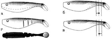 Рис. 5. Меры для повышения активности игры твистера: Можно использовать и другие способы, которые “активизируют” хвост (рис. 5б, в, г). Не вредно экспериментировать и с подгонкой виброхвостов, причем начать можно даже с неподвижной части. Ведь большинство стандартных моделей имеют довольно высокое тело, т. е. имитируют крупную рыбку. Такая добыча хороша для щуки, а вот судак и окунь предпочитают узкотелых мальков. Поэтому при необходимости можно подрезать низ приманки и таким образом “сузить” ее (рис. 6а).