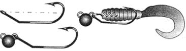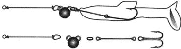 Рис. 9 Свободная оснастка двойником на внутреннем стержне. Итак, свободная оснастка — это подвижное соединение груза и приманки, как правило, через заводное колечко. Она удобна, т. к. полностью взаимозаменяема. Ведь в большинстве случаев, например в поездках на незнакомые водоемы, приходится часто перенастраивать снасть. Разборная система позволяет обойтись гораздо меньшим количеством “рыбок”, грузов, крючков и поводков. Чем таскать с собой кучу всех возможных вариантов, достаточно иметь несколько сменных элементов и, подбирая нужные из них, ловить в любых условиях. Поэтому свободную разборную оснастку можно считать универсальной. Рассмотрим более подробно все ее элементы: 1. Приманка. Сразу же следует отметить, что для свободной оснастки желателен виброхвост. Твистер же, как правило, непригоден. Это объясняется тем, что виброхвост имеет высокое тело и крючки гораздо проще расположить в его нижней части, чем внизу цилиндрического тела твистера. Правильно оснащенный виброхвост имеет центр тяжести ниже точки крепления и на свободной оснастке идет устойчиво. Твистер же оказывается неуравновешен, “заваливается” на бок, а из-за наличия вращающего момента обычно идет косо. Поэтому я и рекомендую для свободной оснастки только виброхвост. Единственной особенностью здесь является сквозное отверстие для внутреннего монтажа оснастки. Если такого отверстия нет, то его нужно проткнуть шилом или толстой иглой от переднего торца “рыбки” примерно до середины нижнего края. 2. Каркас. В сквозное отверстие вставляется проволочный каркас с крючком. Он делается такой длины, чтобы переднее ушко выходило из головы приманки, а через заводное кольцо оно крепится к грузу. Задняя часть каркаса обычно выполняется тоже в виде петельки, куда вставляется двойник нужного размера. Петелька слегка обжимается, чтобы крючок не болтался, но чтобы его можно было вытащить. Если же вы хотите заменять не только двойники, но и тройники, то сзади каркаса делается застежка в виде скрепки. Проволока должна быть достаточно жесткой, но и такая при больших нагрузках может разогнуться. Поэтому в ответственных случаях лучше сделать несколько уже закрученных каркасов с тройниками. 3. Груз. При ловле на пластиковые приманки используется как равномерная, так и ступенчатая проводка. Считается, что при равномерной лучше “чечевица”, т. к. она более плавно обтекается водой. При обтекании же шарового груза за ним образуется небольшая зона завихрений, которая может влиять на игру приманки. Наверное, это справедливо для вращающихся блесен с шаровой груз-головкой, где турбулентный след мешает работе лепестка. Но у виброхвоста рабочая часть находится далеко сзади и почти не подвержена влиянию завихрений, разве что при самых больших грузах и самых малых “рыбках”. По крайне мере, моя практика равномерной проводки не показала заметной разницы в клеве между шаровыми головками и “чечевицами”. К тому же, как мы уже отмечали, шаровой груз имеет преимущество перед “чечевицей” при ступенчатой проводке резиновых приманок. Ведь на дне “чечевица” падает на бок, “рыбка” — тоже и крючки чаще цепляются за дно. Кроме того, нарушается последовательная игра приманки, т. к. при следующей потяжке груз и “рыбка” должны “восстановиться” в рабочее положение, на что теряется часть полезн