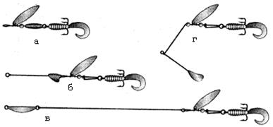 Резиновая добавка или твистер плюс блеснаДобавление твистера к блесне значительно улучшает клев. Такая комбинация, причем как с вращающейся, так и с колеблющейся блесной, дает очень “весомые” результаты. Любой хищник ловится лучше, если на тройник блесны одета резиновая добавка. Таким способом за последние сезоны было поймано множество самой разнообразной рыбы. Это и щуки, и судаки, и жерехи, и язи, и голавли, а особенно окуни. Именно “полосатые” больше всех других “неравнодушны” к твистеру и хватают его очень жадно. Даже самые мелкие окуньки смело атакуют “резинку”. Схватит “матросик” приманку за кончик и не отпускает аж до тех пор, пока его не поднимешь из воды. И только тогда, уже в воздухе, бросает такой вот хищник добычу чуть меньше себя и шлепается в родную стихию, вызывая улыбку рыболова. А уж крупный окунь берет приманку взаглот так, что не сразу вытащишь; и засекается всегда надежно. При хорошем клеве окуня впереди блесны можно поставить добавочный твистер на коротком поводке. Это даст возможность вытаскивать иногда сразу по две рыбины. При обычном клеве такой необходимости нет, т. к. окунь в большинстве случаев берет основной твистер на тройнике блесны. А вот подсадка мини-твистера к мини-вертушке часто дает возможность перехитрить рыбу, которая на “голую” блесну берет крайне неуверенно. Это прежде всего жерех, язь и голавль. За последние сезоны мои уловы “белой” рыбы выросли в 2–3 раза. За счет чего? Уверен — только за счет резиновой добавки, ведь если рыба все-таки срывает хотя бы кончик твистера, клев сразу же резко ухудшается. А хорошо играющий твистер часто преследует целая стайка язиков или голавликов, пытаясь цапнуть вьющийся хвостик. На маленькую вертушку с резиновой добавкой попадаются даже такие “мирные” рыбы, как лещ, плотва, карась. Что касается щуки и судака, то и здесь готов утверждать, что резиновая добавка на вращающейся блесне значительно улучшает клев. Щука вообще часто берет вертушку с твистером ювелирно — самым краешком пасти, как бы стараясь не зацепить блесну, а схватить только резинку. Это позволяет вытаскивать попутно при ловле окуня весомых щук на мелкую вертушку без поводка, т. к. в зубастой пасти оказывается только крючок; блесна же остается снаружи, и леска не перерезается. На рис. 1 приведены четыре варианта оснастки вращающихся блесен: с грузом-сердечником, с грузом-головкой, с вынесенным (отдельным) грузом и с грузом-коромыслом.