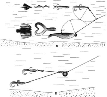 Рис. 5. Использование дополнительных искусственных приманок: Двойные приманки (дополнительная приманка)Кто из нас не мечтал поймать сразу две рыбы? Но каким образом? Довольно просто — использовать сразу две оснащенные приманки. Можно использовать как одинаковые модели, так и разные; как одного цвета, так и двух. Если используются идентичные, но разноцветные приманки, то можно быстро определить, какой цвет рыба сейчас предпочитает. Когда большинство поклевок явно приходится на один цвет, а другой “работает” слабо — есть смысл обе приманки поставить “правильной” окраски. Этот факт прибавляет доказательств того, что рыба хорошо различает цвета, и этим тоже нужно умело пользоваться. Для разведки сначала используем разноцветные приманки, затем оставляем лишь те тона, к которым “тяготеет” рыба. С двойной приманкой можно быстрее определить, какой тип насадки сегодня больше нравится хищнику. Если на один крючок насадить твистер, а на другой — виброхвост, то через несколько поклевок можно делать первые выводы. Такие же эксперименты проводятся и с размером приманки. Ведь именно в сравнении и открывается реальная картина. Особенно интересно экспериментировать не одному, а коллективом единомышленников. Таким образом, применение сразу двух приманок имеет несомненные преимущества: 1. Быстрая разведка — какой тип, размер и цвет приманки сейчас предпочитает рыба. К недостаткам относятся повышенная зацепляемость, усложненность и применение оснасток, которые приходится делать самому. Так как частой добычей является щука, обе приманки должны иметь прочный поводок — и это обязательно! Не один раз я “прокалывался” на этом, почему-то считая, что крупную нижнюю приманку будет брать щука, а небольшую верхнюю — окунь, поэтому верхнюю сначала ставил на обычный поводок из лески. Несколько аккуратных срезов быстро убедили в том, как я заблуждался.
