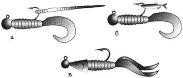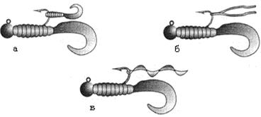 Рис. 4. Использование дополнительных натуральных приманок В России такие “новшества” не в моде, у нас вряд ли кто-то будет подсаживать на блесну или резину еще и червяка, поэтому привожу компромиссные варианты (рис. 5). Предложенный О.Соболевым дополнительный хвостик твистера другого цвета действительно частенько выручает. Вместо него можно просто привязать за крючок длинную нитку красного цвета или резиновую спиральную ленту.