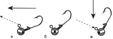 Рис. 1. Акустические элементы в груз-головках: “Свистящие лунки”. В одном или обоих боках груз — головки сверлятся лунки или сквозное отверстие. Такие элементы при обтекании их водой свистят, как свистит гильза от патрона. Если удастся подобрать нужный звук — вам повезло. Погремушки Если вы сами отливаете грузила, то можно в форму поместить какой — либо бубенчик или погремушку. После заливки такой звуковой источник окажется внутри груз-головки и будет исправно играть свою роль. Другой вариант — это помещение погремушек в специальные углубления. Можно просверлить лунку и на клею посадить туда звуковой элемент. Наиболее удачным вариантом является “шумящий глазок” (рис. 1б), который используется в воблерах и в некоторых резиновых рыбках, иногда он продается и отдельно. Внутри прозрачного глазка свободно катается шарик и издает привлекающие звуки. Один или два таких элемента крепятся в специально подготовленные лунки на клей и даже внешне напоминают рыбий глаз. Несомненным плюсом здесь является то, что применяется уже проверенный источник звука, который именно привлекает, а не отпугивает рыбу К сожалению, даже сейчас найти такие изделия непросто. Вместо “глазка” можно использовать и другие элементы, например корпус шумящей мормышки. Он состоит из двух спаянных или склеенных половинок в виде капсюлей, между которыми помещена дробинка. Такой “бочонок” с дробинкой устанавливается в груз — головку либо как глазок, либо по-другому. Можно влить или вставить в просверленное отверстие тонкую трубочку с одной или несколькими дробинками. Здесь важно правильно определить угол наклона трубочки. Например, шаровая джиг-головка при подмотке и при свободном падении наклоняется на разный угол, например 20 и 60 градусов (рис. 2). В таком случае, если мы расположим трубочку горизонтально под “средним” углом 40 градусов, то находящиеся в ней шарики при подмотке и падении будут перекатываться “туда — обратно”, — и звук будет максимальным.