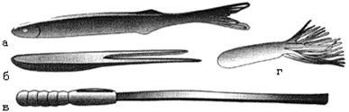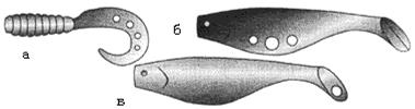 Рис. 8. Модели пластиковых приманок с горизонтальным хвостом: Если хвостовой элемент достаточно длинный, то он даже в воде заметно провисает, а при прямой проводке слегка колышется. Если же проводка неравномерная, то игра хвоста еще более эффективна. Такие приманки занимают промежуточное положение между активными и пассивными, я бы назвал их полуактивными (“кальмары” с длинными щупальцами, “длинные черви”). Аналогично могут быть выполнены и поролоновые рыбки с горизонтальным или удлиненным хвостом-кисточкой (рис. 9).