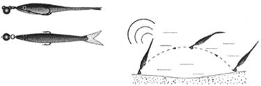 Рис. 7. Двойные приманки: Эти “двойные коромысла” я применяю с большим успехом и считаю их на сегодняшний день оптимальными и для спиннинга, и для дорожки. Феномен “двойных приманок” можно попытаться объяснить, используя теорию питания рыб, основные моменты которой таковы: 1. Сама рыба может быть очень голодной, просто голодной, неголодной, сытой и объевшейся. Только сочетание этих двух факторов дает массу всевозможных комбинаций. Например, очень голодный хищник может схватить практически любую приманку. А вот сытая рыба захочет попробовать разве что деликатес или экзотику. Эта теория, кстати, объясняет тот факт, что хищники часто “клюют” на абсолютно непривычные лимонный и ярко-красный цвета. Деликатес? Экзотика? А если рыба видит “на столе” сразу два “блюда”? Аппетит разгорается! Хоть одно — да попробует! Опять же эффект погони нельзя сбрасывать со счетов. Как-то за рыбалку мне удалось трижды вытаскивать по паре увесистых окуней сразу. Поэтому смело рекомендую и вам попробовать двойные приманки. Особенности ловли на пассивные приманкиК пассивным относятся приманки, не имеющие собственной игры. Это пластиковые рыбки, черви, кальмары и поролоновые приманки. На прямолинейной проводке они не колеблются и не вьются, как твистеры и виброхвосты, и не “дышат”, как полуактивные модели, а просто скользят за грузом. Игра таких приманок наблюдается только в вертикальной плоскости, т. е. вверх — вниз, причем она не происходит сама по себе, а достигается подергиванием удилища или неравномерным вращением катушки. Вывод здесь может быть только один: рыболов, применяющий пассивные приманки, должен гораздо активнее работать снастью. Очевидно, что раз на равномерной проводке пассивные варианты не играют, то и применяются они в основном на волнистой, а особенно на ступенчатой проводке. Самое интересное, что активная игра, оказывается, не всегда нужна. Ведь и мертвая рыбка на снасточке, и поролонка, и пластиковая пассивная приманка в некоторые моменты имеют свои преимущества, именно поэтому они и применяются до сих пор. Здесь включаются в работу другие факторы: внешний вид и скользящий характер движения. Понаблюдайте за живыми рыбками. Довольно часто они плывут легко и незаметно, без видимых колебаний, особенно по течению, а часто сделают два — три толчка хвостом и скользят, скользят, скользят… Или кормящаяся рыба — она тоже не торопясь, копошится у дна, планируя туда — сюда. Замедленные движения особенно характерны для рыб в холодное малокормное время (конец осени, зима, начало весны), а также при резких болезненных колебаниях погоды. Да и хищнику проще схватить малоподвижную добычу, напоминающую больную рыбку. К недостаткам следует отнести уже отмеченную активную работу самого спиннингиста, а также то, что пассивные приманки дают очень слабые колебания воды — хищнику их труднее “услышать”. Последний недостаток частично устраним — есть модели, у которых хвостовой элемент расположен горизонтально (рис. 8). Такие хвосты в воде от рывков то изгибаются, то расправляются, создавая более сильную упругую волну. Некоторые образцы снабжаются дополнительно небольшим пропеллером, помогают и “акустические добавки”.