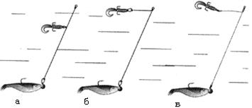 Рис. 6. Варианты использования дополнительной приманки: Варианты оснащения двойных приманок вы видите на рис. 6. Они довольно просты и эффективны, но все же не лишены недостатков, основной из которых — захлест верхней приманки. Поэтому захотелось сделать лучший вариант. Мы уже упоминали спиннер — бэйт — комбинацию джиг-головки с вращающимся лепестком на проволочном коромысле. Но там лепесток только привлекает рыбу, а не ловит. А что если заменить его на “ловящую” приманку? Сказано — сделано, и результат оправдал самые радужные ожидания. Некоторые проверенные варианты вы видите на рис. 7, там же изображено правильное построение “коромысла”. Верхняя часть его должна заканчиваться застежкой или заводным колечком, чтобы мешять при необходимости вторую приманку. Для ловли окуней, которые часто преследуют добычу целой стайкой, “коромысло” можно расположить не только вертикально, но и горизонтально (рис. 7д).