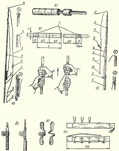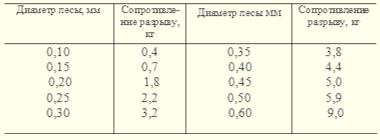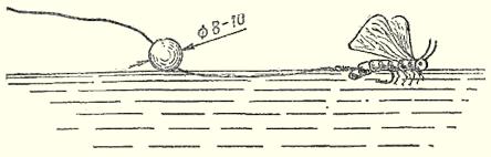 Хранить лесу следует в темном, прохладном и сыром месте. Жилковые лесы теряют прочность, если они высохнут в растянутом виде. Каждый раз перед намоткой на мотовильца или катушку лесу необходимо сушить, лучше в тени. Если по каким-либо обстоятельствам, складывающимся на рыбалке, нет возможности просушить лесу, то наматывать ее нужно свободно, не натягивая, например просунув пальцы между удилищем и наматываемой на мотовильца лесой. Лучшими цветами лесы являются серо-зеленый, сине-зеленый и коричневый различной плотности. Радужная окраска хороша только для ловли в солнечную погоду в верхних слоях воды. Крючок — это самая дешевая часть удочки и в то же время самая главная и ответственная. Промышленность выпускает разнообразные крючки, но не очень высокого качества. Лучшими из отечественных пока являются киевские. Неплохие и кованые крючки Колюбакинского завода. Крючки с коротким цевьем применяются для растительных насадок: мятого хлеба, теста, зерен, а также для мелких насекомых и личинок. Они лучше маскируются в приманках, но несколько хуже засекают рыбу. Крючки с длинным цевьем нужны для наживки червей, гусениц, майского жука, кузнечика, живца, лягушонка, рака и других крупных наживок. Они хороши для ловли налима и рыб, жадно и глубоко заглатывающих приманку. При слабом клеве, особенно зимой и летом, а также при ловле осторожных рыб они хуже крючков с коротким и нормальным цевьем. Жало крючка, отогнутое в сторону от цевья или подогнутое к цевью, работает хуже, чем параллельное цевью. Особенно опасна слишком глубокая подсечка жала крючка. Когда образуют бородку жала, она может как бы пересекать тело крючка. Подсечка не должна превышать 1/3 части сечения. Крючки с головкой колечком необходимы только для их привязывания к металлическим поводкам. Крючки с головкой лопаточкой лучше маскируются в приманке, но требуют тщательного соблюдения правил привязывания. Перед привязыванием крючка с лопаточкой конец лесы лучше размочить в теплой воде. В крайнем случае, например на рыбалке, можно подержать конец лесы во рту в течение 2 мин. Еще лучше завязанный уже и высохший узел на крючке покрыть клеем БФ-2 и дать клею сохнуть сутки. Есть и белые, полированные и никелированные крючки, они требуют привязывания с обязательным покрытием узла клеем. Цвет применяемых крючков должен соответствовать цвету приманки. Белые крючки применяются для мятого белого хлеба, теста, опарыша, малька, живца и других приманок. Темные крючки хороши для мальков и живцов темных цветов, почти для всех зерен, гусениц, жуков и червей. Основное в крючке — острое жало. По мере необходимости его можно затачивать бархатным надфилем или мелкозернистым брусочком, чтобы оно само впивалось в ткани рта рыбы. Поплавок — средство связи рыболова с невидимым ему крючком. Это сигнализатор прикосновений рыбы к приманке. В то же время при ловле близ поверхности воды поплавок часто настораживает рыбу. Это заставляет рыболовов применять возможно меньшие по размеру поплавки и избегать их яркой раскраски. Рыболову необходимо понимать «разговор» поплавка, его сигналы на воде при разных прикосновениях рыбы к приманке и задевах ее за дно. Для этого служат такие выражения: «трогает», «дробит», «качнуло», что относится к легким прикосновениям рыбы, а также «повела», «взяла» и «утащила», что о