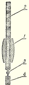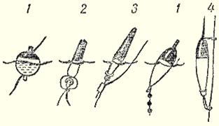 Рис. 2. Способы крепления поплавков в лесе: Задача рыболова — определить по сигналам поплавка момент подсечки, момент, когда рыба, взяв приманку, убедилась в ее съедобности и пошла, заглатывая. Для сигнализации этого обычного в ловле рыбы момента пригодны все поплавки. Обычные поплавки, куда бы рыба ни тащила приманку, ныряют и погружаются. Исключение составляет поклевка леща со дна и красноперки при слишком большом спуске, когда рыба кладет поплавок и ведет его в сторону, не погружая. Обычно эти поплавки не показывают момента, когда рыба вместе с водой втягивает приманку в рот. А ведь очень часто рыба, в период опасности или когда приманка не нравится, выплевывает ее. Принимая во внимание эти обстоятельства, рыболовы — неугомонные экспериментаторы — изобрели новый, так называемый чудо-поплавок, обладающий обратной связью. Он не только погружается, но и всплывает, показывая при этом, подобно мормышке с кивком, любое касание рыбы к приманке. В продаже таких поплавков еще нет, но их можно изготовить своими силами. Чудо-поплавок состоит из пенопластовой или пробковой оливки, длинного стержня из колотого бамбука или твердого дерева и металлической петли со стерженьком. Оливка 1 через отверстие по оси надевается на стержень 2. К стержню обмоткой на клею 88 Н (или другим способом) крепится петля из толстой балалаечной струны, на которую заранее надевается цевье крючка № 8,5–10 с головкой колечком. Поддев крючка с жалом удаляется кусачками. Петля с цевьем крючка представляет примитивный шарнир 3. На лесу поплавок крепится через хлорвиниловую трубочку 4 от изоляции со слаботочных проводов. Стерженек шарнира (цевье крючка) должен плотно входить в трубочку, надетую на лесу (рис. 3).
