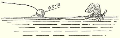 Рис. 3. Чудо-поплавок. Главный секрет работы поплавка в регулировке его огружения. Первое от крючка грузило маленькое. Оно должно погружать в воду 2/3–3/4 части стержня поплавка без оливки. Ставится оно в 3–4 см от крючка, что зависит от толщины и жесткости поводка. Регулировать нужно так, чтобы при подъеме крючка на вертикально висящем поводке поднималось и грузило без большого прогиба поводка между ними. Второе грузило более крупное, оно ставится выше первого на 10–12 см и должно погружать в воду почти всю оливку. Оба грузила и крючок должны погружать в воду собранный поплавок, оставляя над поверхностью 1/4–1/3 часть стержня выше оливки. Стержень поплавка покрывают горячей олифой и окрашивают двумя-тремя тонкими поперечными полосами темно-коричневого цвета. В тот же цвет окрашивают и оба грузила. Этот поплавок всплывает, высовывая из воды весь стержень до оливки при всасывании рыбой приманки в рот. Это момент подсечки. При ловле на крупные и крепкие приманки (червь, картофель, сальник, веретенка, пиявка и т. п.) подъем поплавка используется как предупреждение. Подсекается рыба, когда она топит его. Если переделать продающиеся в наборах удлиненные капроновые поплавки, они станут вполне приемлемыми. Для этого поплавок надо перевернуть «вверх ногами», т. е. длинный нижний стержень использовать как антенну, а за короткий конец (ранее — верхний) прикрепить кольцо шарнира для крепления к лесе. И другие удлиненные веретенообразные, легкие поплавки также могут быть пригодными для замены чудо-поплавка, нужно только не забывать при этом размещать маленькое грузило у крючка. Такие чувствительные поплавки особенно необходимы для ловли плотвы и других рыб, отличающихся осторожными, «вороватыми» поклевками. Для ловли хищных рыб на живца, малька, рака, лягушонка, веретенку, выползка и пиявку, а также для ловли поверху на насекомых они непригодны (рис. 4). Рис. 4. Поплавок для ловли поверху. При ловле поверху на насекомых хорош поплавок из коры осокоря (ивы) размером с большую горошину. Для ловли на майского жука употребляется такой же поплавок размером со сливу. Осокоревые поплавки следует отполировать какой-либо деревянной рукояткой, а затем пропитать горячей олифой. Если поплавок изготавливают из пробки, его красят под цвет коры или обжигают. Для ловли поверху необходима маскировка поплавка. Яркие поплавки отпугивают рыбу. Даже леса, лежащая на воде, слегка продавливает поверхностную пленку, что в солнечную погоду очень настораживает крупную рыбу. Лучшим способом крепления поплавков к лесе служит вышеприведенный, т. е. с помощью трубочки и стерженька. Такая оснастка позволяет легко снимать и заменять поплавок, передвигать его по лесе. Возможность легкого съема и постановки поплавка на лесу очень важна. Поплавки следует всегда снимать перед укладкой удилища в чехол и сохранять в жестком пенале. Следовательно, в зависимости от способа ловли рыбы, необходимо пользоваться различными поплавками. Особое значение имеет чувствительность поплавка. На нее влияют не только величина и форма поплавка, но и способ соединения с лесой. Лучше всего крепить поплавок к лесе в одной точке, чего можно достичь лишь шарнирным соединением. Катушка, без которой почти не обходится современное ужение. Применение катушечной оснастки (пропускные кольца и катушка) позв