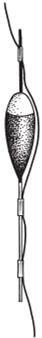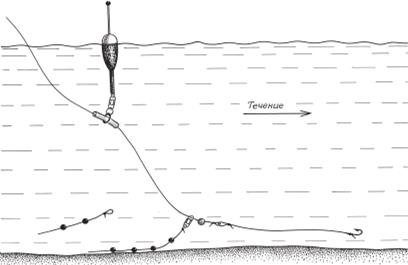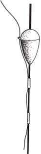 Рис. 4. Поплавок для ловли на быстром течении у плетня Следует также иметь поводки различной длины с крючками разного размера, которые быстро присоединяются к карабинчику основной лески. Обычно при ловле у плетней рыболовы используют крючки с длинным и коротким цевьем, подобранные по размеру насадки: для белой рыбы – № 4-18, для хищников – № 1/0-8 (одинарные, так как двойники или тройники значительно усложняют ловлю на течении). Оснастка поплавочной удочки для ловли хищника (крупный окунь, судак, жерех, щука)Если белая рыба вдруг перестала клевать, возможно, в ее угодья вторгся хищник. Поэтому под рукой желательно еще иметь и поплавочную живцовую удочку, а также малька в кане. Оснастка должна быть бегучая, а кольца на удилище и безынерционная катушка – хорошего качества, так как нагрузки при вываживании крупного бойкого хищника бывают приличные. Так как в зоне у плетня, как мы сказали, появляются разные хищники, то оснастка рассчитывается под живца, который максимально соблазнителен для того или другого хищника. Для ловли щук среднего размера, судаков и жерехов можно порекомендовать довольно жесткое удилище типа «болоньез» с быстрым строем Основная леска должна быть диаметром 0,32-0,35 мм, поводок – диаметром 0,3–0,32 мм. Поводок, через карабинчик и вертлюжок, можно ставить короткий, средний, длинный – в зависимости от того, какую амплитуду движения на струе вы хотите задать живцу. Для ловли щуки, конечно, нужно ставить съемный металлический, но мягкий и тонкий поводок Поплавок должен крепиться к леске неподвижно. Вполне годится яйцевидный бескилевой поплавок с тестом 7-20 г, по оси которого проходит фиксирующий стержень-антенна. Огружают поплавок оливкой, неподвижно зафиксированной вблизи места крепления поводка, или скользящей оливкой, которая на леске стопорится бусинкой, упирающейся в вертлюжок, к которому присоединяется концевой карабин (служит для присоединения сменных поводков). При выборе величины живцового поплавка руководствуются правилом: чем больше живец, тем крупнее должен быть поплавок. Для ловли окуня в качестве живца хорошо взять плотвичку, уклейку, пескарика длиной от 3 до 5 см. Для ловли не слишком крупного судака и такой же щуки подойдет плотвичка, уклейка, красноперочка, маленький голавль, ерш, пескарь, елец размером от 5 до 7 см. Жереху больше по вкусу белая верховая рыбка – уклейка, голавлик длиной 4–6 см. Что касается жереха, он редко подходит близко к рыболову, но нередко плещется на отдаленных струях ниже плетня, куда и следует посылать верховой проводкой живца. Остальные хищники, если глубина в месте ловли не меньше двух метров, вполне могут подходить вплотную к мостку рыболова. ПолудонкаПоскольку возле плетня часто крутятся хищники, целесообразно одновременно с ловлей белой рыбы впроводку закинуть одну или даже две полудонки, наживив на их крючки живца. Полудонку можно расположить перед фронтальной частью плетня, чтобы снасть не мешала проводке, или в самой ближней зоне – от плетня к берегу. Для того чтобы оснастку не сносило течением и она не усложняла рыбалку, нужно четко рассчитать вес грузила. Еще один момент: чтобы одновременно ловить белую и хищную рыбу, предварительно нужно сделать специальные подставки для удилищ – рогульки, на которые можно положить выбранную из воды снасть и заняться вываживанием
