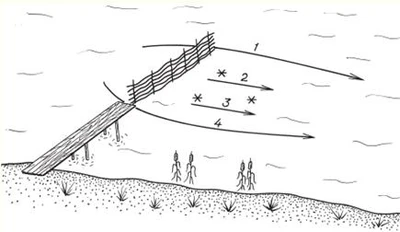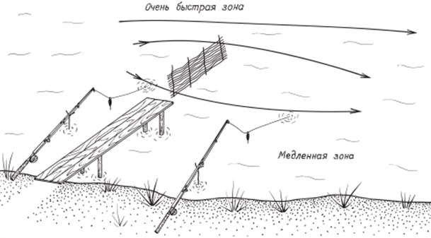 Благодаря плетням, которые устанавливают на быстрых реках рыболовы, заметно увеличивается улов. В тиховодье у плетней с большим успехом ловят как рыб карповых пород, так и различных хищников. Но в этой ловле очень много всевозможных мелочей и различных деталей. Также потребуются и специальные снасти. На таких реках, как Ока, Кама, Дон и многих других, рыбалка осложняется тем, что рыбу на быстром течении очень сложно ловить обыкновенной удочкой. Проводка получается слишком быстрая, и некоторые виды белой рыбы, такие как лещ, густера, белоглазка, плохо на нее реагируют. Часто стаи леща, густеры, плотвы, белоглазки можно обнаружить в тиховодных речных заводях, но таковые у берегов быстрых рек встречаются не часто. Однако стаи белой рыбы легко заходят под прикрытия искусственных заграждений, которыми в некоторых местах частично перегораживают реки. Например, на озере Балатон в Венгрии одному из авторов доводилось с успехом ловить крупную плотву в заводи, образованной нерабочим паромом, который стоял у берега залива, а вдоль этого берега бежало течение от впадающей речушки. Видимо, плотва в заводи находила укрытия от хищника, так как между бортом и берегом в одном месте выросла целая плантация густых водорослей. А на водорослях, очевидно, очень интенсивно развивались водяные организмы, которые служили рыбе кормом. Но все же кормовая конкуренция в той заводи у рыб была очень высока, поэтому они сразу реагировали даже на кусочек обычного земляного червяка, который был выкопан на берегу. То же самое примерно происходит у плетней, которыми рыболовы перегораживают течение реки возле берега. Для этого в дно в одну линию на небольшом расстоянии друг за другом забивают колья и оплетают их заготовленными гибкими прутьями. Эта изгородь надежно перекрывает течение, постепенно плетень забивается различным плавающим мусором, коряжками, водорослями, и образовавшаяся заводь становится весьма привлекательной для различной белой рыбы. Выходя кормиться на течение, она возвращается в затишье у плетня передохнуть. А если дозированно, чтобы не перекормить, но достаточно регулярно подавать прикормку, то рыба скапливается в созданном тиховодье очень плотно. Плетень можно устанавливать вплотную к берегу, если позволяет глубина, или вдали от берега. Например, на Упе, где дно преимущественно илистое и под берегом идут сразу глубины в 1,5–4 м, плетень устанавливают так, что один его край примыкает к берегу или находится от него совсем недалеко, на расстоянии 1–2 м. На Окских же перекатах, где дно каменистое, а подходящие глубины начинаются в 6-10 м от берега, приходится мастерить плетень в отдалении. Плетни рыболовы устанавливают ежегодно, так как весенний паводок обычно их ломает. Для того чтобы рыболов располагался у плетня с комфортом, на берегу вырубается ступеньками место (если берег крутой и плетень стоит к нему вплотную) или выстраивается по воде мосток (если плетень находится в отдалении от берега). Между мостком и плетнем делается квадратная площадка из досок для размещения рыболова. По ее периметру делаются бортики из невысоких брусьев, чтобы что-нибудь из рыбацкой экипировки случайно не скатилось в воду. И мосток, и площадка ставятся на надежные сваи, чтобы при движениях рыболова мосток не раскачивался и не распугивал рыбу. Рис. 1. Место концент