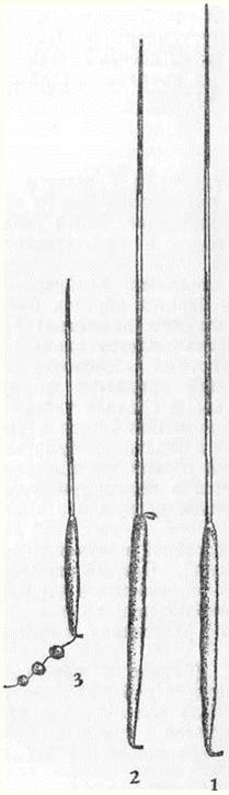 Самым важным и трудоемким в изготовлении элементом рассматриваемой рыболовной снасти является поплавок. Он представляет собой своеобразную комбинацию скользящего и сверхчувствительного поплавков. Основной деталью поплавка является бамбуковый стержень. Для изготовления его берется обрезок бамбуковой палки (как можно большего диаметра) не длиннее 400 мм и аккуратно раскалывается вдоль на несколько частей. Затем одна из грубых заготовок тщательно обрабатывается ножом (ей придается форма иглы: диаметр у основания – 3 мм, в средней части – 2,5 мм и на кончике – 1,5 мм), затем шлифуется крупнозернистой и мелкозернистой наждачной бумагой, войлоком до получения абсолютно ровной поверхности. Готовый стержень легко сгибается в полуокружность, не трескается, не ломается и, будучи погружен в воду, всплывает на поверхность. Его необходимо окрасить водостойкой и яркой (желательно флюоресцентной) краской. Острый кончик стержня (на длину до 150 мм) окрашивается в черный цвет (красный при длительном наблюдении за поплавком, – тем более на значительном расстоянии, сильнее утомляет глаза). Следующая часть поплавка (ближе к середине стержня) длиной 100 мм окрашивается в белый цвет, и желательно, чтобы эта краска была ослепительно белой. Следующие 100 мм окрашиваются в красный цвет. Оставшаяся часть длиной 50 мм окрашивается в белый цвет. Если были соблюдены все условия изготовления стержня (длина, толщина, форма), то при погружении его в воду можно убедиться, что он либо очень медленно тонет, либо очень медленно всплывает. Следовательно, вес стержня приближен к удельному весу воды. Второй составной частью поплавка является основание. Брусочку твердого пенопласта длиной 150 мм вначале ножом, а затем наждачной бумагой придают веретенообразную форму. Диаметр брусочка в нижней части – 10 мм, а в верхней – 12–14 мм. В торце нижней части пенопластового основания тонким шилом или металлической спицей проделывают отверстие глубиной не более 20 мм. Затем из стальной нержавеющей проволоки диаметром до 1 мм изготовляют пропускную петельку для лески. Делают это так: кусочек приволоки длиной до 50 мм сгибают в скобку, чтобы концы ее были параллельны, а расстояние между ними составляло не более 1,мм и в него свободно проходила леска диаметром 0,5 мм. Затем, отступив от закругленной части скобки на 10 мм, загибают ее под прямым углом к параллельным концам. Концы сжимают пальцами, смачивают в водостойком клее и вставляют в углубление, сделанное в пенопласте, до упора. Сочленение петельки и пенопласта обрабатывают несколькими слоями водостойкого клея и окрашивают белой краской. В торце верхней, более широкой части пенопластового основания проделывают аналогичным образом отверстие глубиной 25 мм, но немного шире первого, куда опять же на клею вставляют нижнюю (более широкую) часть бамбукового стержня. И здесь место соединения стержня и пенопласта тщательно смазывают несколькими слоями клея и окрашивают. Рис. Скользящие сверхчувствительные поплавки: 1 – с одной пропускной петелькой; 2 – с двумя пропускными петелькэми; 3 – для ловли на мелких местах Поплавок почти готов. Теперь к нему необходимо подогнать грузило (и наоборот, поплавок – к грузилу). К петельке пенопласта привязывают кусок лески диаметром 0,4 мм, на котором защемляют грузило-дробинку (советуем сразу же приобр