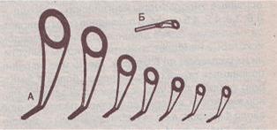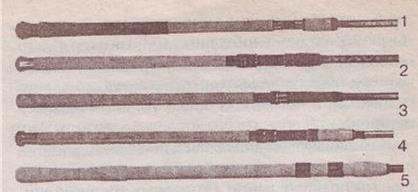 Рис. 5. Кольца для удилищ пропускные (А) и «тюльпан» (Б) Немаловажным для ловли является количество и форма колец. Чем больше колец на удилище, тем, как правило, лучше. Во-первых, нагрузка распределяется равномернее, а во-вторых, леса не прилипает к удилищу в сырую (дождливую) погоду. Наверное, поэтому снасть эта появилась в «стране туманов и дождей» — Англии, в то время как в солнечной Италии более популярен «телескоп» с меньшим количеством колец. Прилипшая к удилищу леса не дает возможности забросить легкую и даже среднюю по тяжести оснастку. Кольца должны стоять на длинных ножках (что препятствует прилипанию лесы) — тоже важный аспект, на который следует обращать внимание при покупке. Многих смущает внутренний диаметр колец — он очень мал. Действительно, если бы удалось поставить на удилище кольца большего диаметра, то заброс был бы дальше. Но тут мы снова сталкиваемся с проблемой перегрузки удилища, ведь чем больше кольцо, тем оно тяжелее. На самом деле, малый диаметр кольца, хотя и снижает дальность заброса (повышая трение лесы о кольцо), но облегчает удилище, тем самым, повышая скорость оснастки в начальный момент вылета. Поэтому заброс получается вполне приемлемым. Плюс к тому — использование тонких лесок. На таких удилищах практически никогда не применяются лесы толще 0,18 миллиметра, а такая леска отлично скользит даже через такие маленькие кольца. Малый диаметр концевых колец также является показателем качественного удилища. Рис. 6. Рукоятки удилищ Теперь о рукоятке и катушкодержателе (рис. 6). Пробка или резина — не имеет принципиального значения. Разве что вы не найдете приличного удилища с чисто резиновой ручкой. Пробка — это просто престижно, а никаких практических преимуществ она не дает. Приличные удилища могут иметь составную рукоятку. Чаще всего — это удилища крупных оптово-торговых фирм, недавно возникших на рынке рыболовных снастей. Подобные фирмы стараются как можно более снизить цену снасти, сохранив основные ее качества. Отсюда и составные рукоятки: низ — пробка, верх — резина, или наоборот (рис. 6, 1). Какой выбрать катушкодержатель — дело ваше. Бывает он трех типов: классический (винтовой, рис. 6, 2 и 6, 4), передний винтовой (рис. 6, 3) и «скользящие кольца» (рис. 6, 5). Первые два, хотя и несколько тяжелее третьего, зато более надежны, и я рекомендовал бы их тем, кто собирается ловить «серьезную» рыбу. Но не следует думать, что третий тип катушкодержателя не надежен. Многие пользуются им даже для ловли карпа. В крайнем случае, если вам необходима 100 % — я надежность, можно закрепить кольца с помощью изоленты. Основное же преимущество, которое дает кольцевой катушкодержатель, — это не меньший вес, а возможность установить его «под руку», то есть в том месте, где вам будет удобнее. «Болонская» снасть (телескопическое удилище с кольцами) Так называемая «болонская» снасть по сравнению с «английской» позволяет ловить «глухим» поплавком на большей глубине, так как имеет большую длину удилища. Тут я сразу хочу предостеречь читателя от покупки длинных удилищ этого типа из стеклопластика. «Стекляшка» длиной 5 метров и более, оснащенная пропускными кольцами, практически не пригодна для ловли. Почему производители снастей оснащают кольцами очень толстые (мощные) стеклопластиковые удилища, — для меня остается загадкой. На худой кон