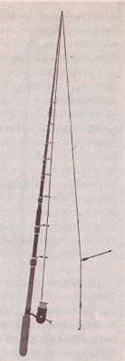 Рис. 2. «Английская» поплавочная удочка «Английская» поплавочная удочка (рис. 2) — штекерное, 3- или 4- составное удилище с большим количеством пропускных колец, пробковой или резиновой рукояткой, с установленным на удилище катушкодержателем, длина удилищ от 3,6 до 6 метров. Обычно оснащается поплавками с одной точкой крепления (скользящими или фиксированными). Применяется при ловле на больших расстояниях от берега, когда нет течения или оно очень слабое. Может применяться и в других условиях. Данная снасть устойчива к ветру и позволяет ловить рыбу на расстоянии от рыболова до 80 м, что невозможно сделать другими снастями. «Болонская», или «итальянская», удочка (рис. 3) — телескопическое удилище с кольцами, установленным на нем катушкодержателем, длина удилищ от 4 до 9 метров. Оснащается поплавком с двумя точками крепления, обычно зафиксированным на лесе, но возможны и скользящие варианты. Отличается от предыдущей тем, что позволяет ловить как в местах без течения, так и на слабом и среднем течении. Имеется ограничение по глубине (не более 4/5 от длины удилища при использовании «глухого» поплавка). Снасть более скоростная, чем предыдущая. Для начинающих лучше использовать снасть с фиксированным, а не со скользящим поплавком. Какую из этих снастей выбрать — это вы поймете из нижеследующего материала. Скорее всего, вам придется пользоваться несколькими видами снастей, даже если вы не будете заниматься спортом. Ведь для водоемов разных типов та или иная снасть всегда будет иметь преимущество перед другой. Подробнее об этом вы можете прочитать в отдельной главе книги.