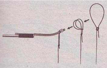 Рис. 7. Крепление лески на маховое удилище с помощью пластиковой застежки Застежка (рис. 7) устанавливается на удилище с помощью обычного «суперклея» или любого другого водостойкого клея. Леса зацепляется за специальный крючок на застежке, на который, для предотвращения самопроизвольного соскальзывания лесы, надвигается защитная бухточка. Это самый «продвинутый» вариант крепления лесы к удилищу — и пользоваться удобно, и леса не деформируется, так как застежка пластмассовая. Амортизатор Таким типом застежки можно посоветовать воспользоваться обладателям «стеклянных» удилищ большой мощности. Это даже и не застежка, как таковая, но тоже годится для закрепления лесы на удилище. При изготовлении амортизатора необходимо иметь резину в оплетке, длиной от 4 до 10 сантиметров. Для этих целей хорошо подходит резиночка, которой крепят бирки к чемоданам в аэропорах. Альтернативой является шляпная резинка, продающаяся в магазинах «Все для шитья», хотя та резинка растягивается хуже. Резинки без оплетки (для штекерных удилищ) нам не подойдут, хотя и растягиваются лучше. Они просто рвутся после нескольких рыбалок из-за воздействия воды и солнца. Если вам не удалось достать резинку, не переживайте. Вместо нее можно использовать тонкий капроновый ботиночный шнурок (или подобную веревочку). Хотя это не будет амортизатором как таковым, роль застежки шнурок выполняет прекрасно. Как установить амортизатор? Приматываем к кончику удилища один конец резинки с перекрытием в 1 сантиметр. Приматывать лучше капроновыми нитками, предварительно смазанными клеем или нитролаком. Намотку (после высыхания клея) желательно покрыть водостойким лаком. На противоположном конце резинки завязываем простой узелок и его так же покрываем лаком. Леса крепится обычной «удавкой», которая держится и не соскальзывает за счет узла (рис. 8).