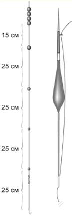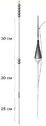 Рис. 8. Оснастка для ловли в медленно текущей воде Во-вторых, если при матчевой или болонской ловле вам придется выполнять забросы на большое расстояние, то равномерное распределение огрузки (рис. 9) может стать причиной перехлестов лески. Очень важно, выполняя такие забросы, контролировать сбегающую с безынерционной катушки леску указательным пальцем правой руки. Схемы монтажа оснастки при различных условиях ловли показаны на рис. 10 и 11. Эти и подобные примеры, которые можно обнаружить в любых других источниках, не должны расцениваться как догма или абсолютное руководство к действию, которое следует неукоснительно соблюдать до миллиметра и сотой доли грамма. Это всего лишь версии, которые могут быть сами по себе весьма динамичными.