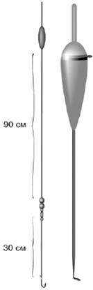 Рис. 9. Оснастка со скользящим поплавком для ловли на течении на большой глубине Оснастка, изображенная на рис. 9, монтируется на леске диаметром 0,14—0,18 мм для ловли на участках с мощным течением и большой глубиной. Она состоит из скользящего (чаще всего) поплавка грузоподъемностью от 6 до 25 г, зафиксированной крупной картечины или оливки и дополнительного, относительно тяжелого грузила (это не подпасок, хотя и может выполнять его функции), которое должно располагаться перед поводком.
