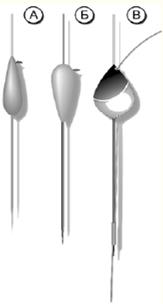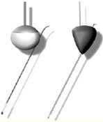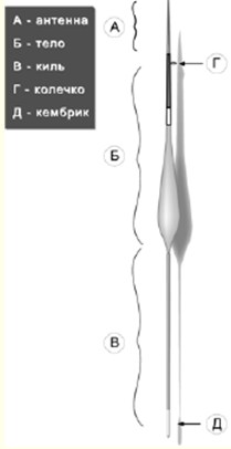 Рис. 3. Поплавки с одной точкой крепления Во втором случае (рис. 3, б) показан вариант глухой оснастки с использованием дробинок, а в третьем (рис. 3, в) – вариант жесткой фиксации с помощью кембрика. Естественно, существуют модели поплавков для ловли в стоячей воде и с двумя точками крепления. Но аэродинамические качества у них намного ниже. Кроме того, леску, фиксируемую к поплавку в верхней его части, намного труднее погрузить под поверхность воды, как это обычно делают рыболовы при дистанционной (матчевой) ловле (рис. 3, г). Поплавки для ловли на теченииНизкая устойчивость поплавка может сделать невозможной ловлю на течении. Наиболее подходящими для такой ловли следует признать поплавки с широким телом, расположенным в верхней его трети или выше (рис. 4) и с двумя точками крепления, что позволяет манипулировать снастью при проводке. Поплавки для ловли на течении обладают тонким металлическим килем. Последний элемент не просто считается признаком хорошего тона. Во-первых, он обеспечивает низкое расположение центра тяжести, а во-вторых, на тонкий металлический киль не так будет влиять течение. Иначе говоря, он более устойчив в вертикальном положении.