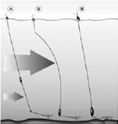 Рис. 10. «Поведение» оснастки на течении Предназначение этого нижнего грузила заключается в выпрямлении отрезка лески между ним и оливкой. Дело в том, что на средних и глубоких участках реки скорость течения не однородна и у дна она намного медленнее, чем в толще воды. Поэтому нижняя часть огрузки должна натянуть (и соответственно повысить чувствительность снасти) тот сегмент лески, который находится у дна и не подвержен мощному напору потока воды (рис. 10, а), нежели отрезок лески между поплавком и оливкой. Расположение же одного, но массивного грузила у дна имеет, по крайней мере, два недостатка. Во-первых, более длинный отрезок лески между грузилом и поплавком, больше подвержен напору воды (рис. 10, б), так как его площадь больше и для его выпрямления приходится увеличивать вес оснастки в целом (рис. 10, в), что уже снижает чувствительность снасти. Во-вторых, перемещающийся у дна массивный груз будет настораживать рыбу. Суммарный вес огрузки должен быть таким, чтобы в результате притормаживания проводки приманка отрывалась ото дна только на незначительную высоту. В противном случае снасть станет неуправляемой. Аналогичную оснастку, только без нижней огрузки, можно использовать для ловли на малька или лягушонка.