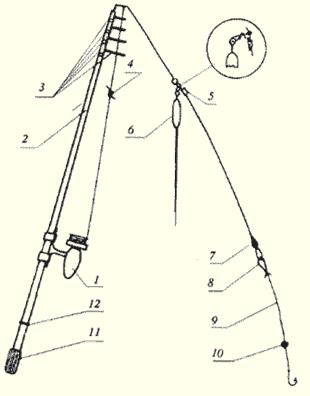 Рис. 3. Поплавочная снасть для дальнего заброса в сборе: 1 — безынерционная катушка; 2 — удилище; 3 — пропускные кольца; 4, 5 — верхний и нижний стопоры; 6 — поплавок; 7 — основное, скользящее грузило; 8 — узел «петля в петлю»; 9 — поводок с крючком; 10 — «подпасок»; 11 — наконечник; 12 — резиновое кольцо (Б.Н. Красноголовый) | |