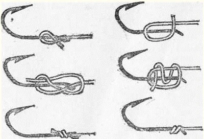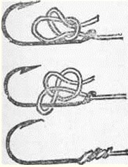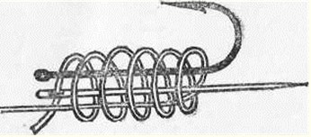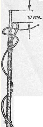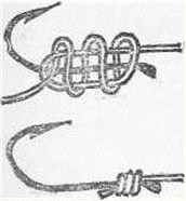 Рис. 2. Петелька На рыбалке трубка плотно надевается на верхнюю часть комлевого колена удилища и крепится резиновым кольцом. Некоторые рыболовы составное удилище оборудуют двумя парами мотовилец. Одну пару делают на верхнем колене удилища для матывания запаса лески и регулирования ее длины, вторую — на втором от верха колене и используют для сматывания лески при перемене места ловли. При ловле с лодки на глубине более 5 м можно снять верхнее колено и использовать его как короткое удилище для подсечки рыбы. Для крепления крючка при перевозке удочки рядом с катушкой или мотовильцами на удилище надевают резиновое кольцо или прикрепляют кусочек пробки. Хорошее удилище длиною 3–4 м можно изготовить самому из березы или орешника, причем наиболее прочны удилища из хлыстов, заготовленных и обработанных осенью, после листопада: в это время древесина становится более плотной. Свежесрезанный прямой хлыст очищают от коры, отступив 70–80 см от вершинки. Толстую комлевую часть срезают ножом или рубанком до нужной толщины. Обработанное таким образом удилище выравнивается и высушивается. Для этого его подвешивают на ветру, но обязательно в тени. К комелю удилища подвязывают груз весом 5—10 кг. Через несколько суток удилище снимают, тщательно очищают острым ножом, осколком стекла от сучков и заусениц, шлифуют тонкой наждачной бумагой и протирают машинным или растительным маслом. После того, как масло впитается и высохнет, в нижней половине подвязывают мотовильца, а в верхней — петельку для крепления леки. Удилище будет прочнее, если заготовленный осенью хлыст очистить от веток и сучков, за верхушку подвесить на шнуре в сарае или на чердаке, привязать к комелю груз и оставить в таком положении на всю зиму. Весной высушенный хлыст снять, обработать и оборудовать удилище. ЛескаВ последние годы для оснащения удочек рыболовы, как правило, применяют капроновую леску (жилку). Она прочна тонка, эластична и малозаметна в воде. Поплавочные удочки с глухой снастью оснащаются леской толщиной 0,15—0,3 мм и длиной 10–15 м. Такая длина лески, намотанной на мотовильца, обеспечивает запас ее на случай обрыва. На катушку наматывается леска длиной около 40 м. Излишек лески путается портит мотовильца, утяжеляет барабан катушки. Толстая леска отпугивает рыбу, поэтому рекомендуется ставить леску возможно тоньше. Вываживание рыбы, имеющей массу в два раза больше прочности лески, не представляет особых трудностей при достаточной выдержке рыболова. Иными словами, имея леску толщиной 0,2 мм, выдерживающую на разрыв до 1,5 кг, можно успешно преодолевать рывки рыбы массой 3 кг. Опытный рыболов сумеет справиться с рыбой, масса которой превышает прочность лески даже в три раза. Дело в том, что в воде масса рыбы составляет не более 1/3 ее фактической массы. Остальная нагрузка на леску создается рывками рыбы, стремящейся освободиться от крючка, и сопротивлением воды при вываживании рыбы. Установка на удилище катушки позволяет применять леску толщиной 0,1–0,2 мм. Для ловли щуки и карпа берется более прочная леска толщиной 0,3 мм и более. Не следует брать леску с большим запасом прочности, рассчитывая на случайную поклевку крупной рыбы, она должна соответствовать массе той рыбы, которую предполагается ловить. Она должна отвечать и упругости удилища: чем оно мягче, тем тоньше и слабее 