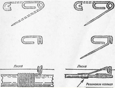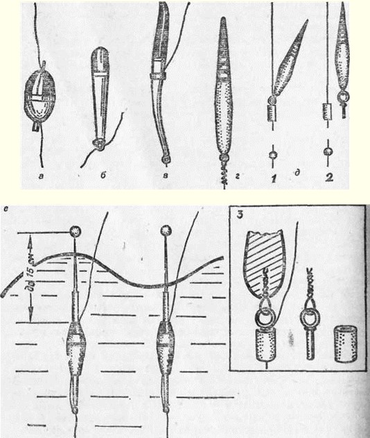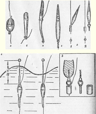 Рис. 4. Узлы для привязки крючков: а — с отогнутым колечком; б — с отогнутой головкой лопаточкой. Внизу — привязывание мелких крючков с помощью иглы ПоплавокПоплавок — обязательная деталь поплавочной удочки. Он сигнализирует о поклевке рыбы и держит крючок с насадкой на определенной глубине. Хороший поплавок имеет максимальную грузоподъемность при возможно меньшем размере, обладает чувствительностью к малейшей поклевке и малым сопротивлением, он прочен, не намокает в воде, удобно закрепляется на леске, хорошо виден издали и не отпугивает рыбу своей окраской. Поплавки изготавливаются из легких материалов — пенопласта, пластмасс, пробки, гусиного пера, сосновой коры (рис. 5). Чувствительность поплавка к поклевке зависит от объема его надводной части, а также от формы. Чем меньше надводная часть поплавка, тем он чувствительнее, Поплавки веретенообразной формы, а также из гусиного пера легко погружаются в воду при поклевке. Способы крепления поплавков к леске различны. В продаже есть поплавки с продольным отверстием посредине, в которое пропускается леска и зажимается палочкой, и поплавки с проволочным ушком, за которое петлей они крепятся к леске. Поплавок можно закрепить, пропустив леску сквозь петлю на нижнем конце и прижав ее к стержню или перу резиновым колечком. Один из лучших способов крепления поплавка к леске — крепление его с помощью изоляционной трубочки от провода и стерженька, скрученного из тонкой медной проволоки (рис. 5). Это обеспечивает строго вертикальное положение поплавка, позволяет без затруднений перемещать его по леске и заменять другим. Размер поплавка подбирается в зависимости от массы грузила и насадки. Так, для ловли леща лучше применять легкий длинный поплавок из гусиного пера, на одну треть выступающий над водой. Для ловли на живую мелкую рыбу поплавок берется такого размера, чтобы живец не смог утащить его под воду. Такой поплавок можно изготовить из пенопласта диаметром около 2,5–3 см, длиной 4–5 см. Леска пропускается в продольное отверстие, проделанное в пенопласте, и зажимается палочкой или отрезком гусиного пера. Рис. 5. Поплавки для летних удочек: а, б — из пластмассы; в — из гусиного пера; г — из пенопласта; д — способ крепления поплавка к леске: 1 — поплавок соединен с трубочкой на леске; 2—поплавок отделен от трубочки; 3 —детали крепления поплавка к леске; е — антенный поплавок Верхняя, надводная часть, поплавков окрашивается в opaнжевый или черный цвет. Лучше, если нижняя, подводная часть будет бледно-серой или голубой. При ловле со дна на глубине свыше 2 м и в мутной воде цвет нижней части поправка не имеет значения. ГрузилоГрузило предназначено для того, чтобы удерживать крючок с насадкой в намеченном месте на нужной глубине и поплавок в вертикальном положении, погруженным в воду на две трети длины. Оно обычно делается из полосок свинца в виде оливки или из надрезанных дробинок. Для огружения поплавка лучше ставить не одно большое грузило, а несколько маленьких. Первая, самая маленькая, дробинка закрепляется в 5—10 см от крючка, остальные, более крупные, — выше, через 10–15 см, пока поплавок не погрузится до нужного уровня. Зажимать дробинки надо осторожно, так, чтобы не повредить леску. При ловле леща со дна первая дробинка ставится в 5 см от крючка. Установка грузила на большом расстоянии от к