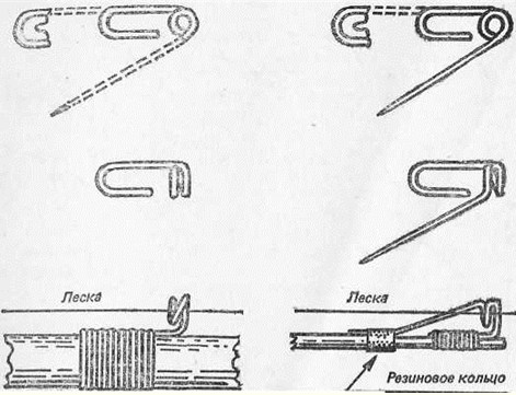 Простота устройства, универсальность и дешевизна летней поплавочной удочки принесли ей широкую популярность. У большинства рыболовов она является основной рыболовной снастью. Поплавочная удочка состоит из удилища с мотовильцами или катушкой, лески, крючка, поплавка и грузила. УдилищеУдилище предназначено для заброса насадки, подсечки и вываживания рыбы. Оно должно быть прямым, легким, упругим, гибким и прочным. Упругость удилища — это способность его вершины возвращаться в первоначальное положение после снятия нагрузки. Упругость обеспечивает подсечку и утомление рыбы при вываживании, а гибкость смягчает резкие рывки и предохраняет леску от обрыва. Удилище может быть сделано из бамбука, березы, орешника, можжевельника. В продаже имеются удилища, изготовленные из стеклопластика. Для удобства перевозки удилища делают составными, обычно, из двух или трех колен. В собранном виде они могут быть длиною от 3 до 5 м. Трубки для соединения колен делаются из легкого, прочного металла и плотно подгоняются. Из удилищ, поступающих в продажу, наиболее прочны бамбуковые и из стеклопластика. Они легки и имеют достаточную упругость. Покупая бамбуковое удилище, следует выбирать колена с темно-желтой или светло-коричневой поверхностью, с короткими промежутками между узлами, так как бамбук с более короткими промежутками между узлами имеет более толстые стенки и плотную древесину. Кроме того, следует смотреть, чтобы на удилище не было продольных трещин, а в местах среза сучков и листьев — глубоких надрезов или сильно обуглившейся древесины. Телескопические удилища из стеклопластика состоят из нескольких колен (конусных или цилиндрических). Эти удилища легки, прочны, способны выдерживать большие нагрузки. Покупая телескопическое удилище, необходимо проверить исправность каждого колена и прочность крепления комлевой пробки, особое внимание следует обратить на прочность сцепления одного колена с другим (длина стыка сцепления должна составлять 1/6 длины колена). По длине и прочности удилище подбирается в зависимости от того, какую рыбу собирается удить рыболов. Для ловли крупной рыбы необходимо прочное и длинное удилище, некрупной — легкое и недлинное. Поплавочные удилища могут оборудоваться как для катушечной, так и для глухой снасти. Установка на удилище небольшой катушки позволяет быстро изменять длину лески, дает возможность на тонкую и легкую снасть вываживать крупную рыбу. Для ловли с катушкой удилище оснащается приспособлением для крепления катушки и пропускными кольцами. На вершинке удилища крепится концевое пропускное кольцо — «тюльпан». Кольца должны быть легкими и небольшими по размеру. Их изготавливают из тонкой латунной или медной проволоки. Наиболее удобны разрезные кольца. В них можно завести или снять леску, не снимая с лески поплавка, поводка и грузила. Хорошие разрезные кольца молено изготовить самому из мелких французских булавок с диаметром спирали 3–4 мм (рис. 1). В зависимости от длины удилища на нем может быть установлено 5–6 колец. Расстояние между кольцами на удилище длиной 4,5 м, считая от комля удилища, может составить 150, 90, 80, 60, 40, 30 см. Проводочную катушку следует покупать самую легкую, вмещающую до 40 м лески толщиной 0,15—0,3 мм. Хороши пластмассовые катушки: они имеют барабан большого диаметра, очень легкие и 