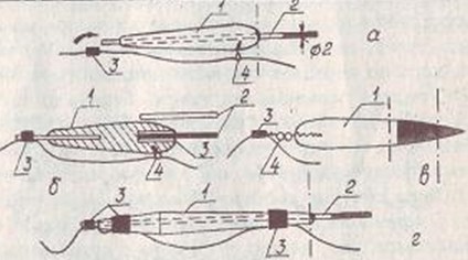 Рис. 5. Некоторые конструкции поплавков: а — спортивный поплавок; б — со сменными антеннами; в — пенопластовый с нижним креплением; г — длинный конический. Нумерация в а, б, в, г одинакова: 1- пенопласт; 2 — антенна из бамбука; 3 — кембриковая трубка; 4 — проволочное колечко Когда-то делали их из пробки или куги. Теперь чаще всего — из твердого пенопласта, бальсового дерева (оно редко и дорого, но, может быть, вам удастся «выцыганить» его у авиамоделистов), сухой сердцевины репейника. Поплавки красят, погружая в достаточно жидкую нитроэмаль, но, пенопластовые — только после обязательного покрытия спиртовым лаком или клеем БФ, иначе нитроэмаль повредит пенопласт. После покраски и сушки весь поплавок покрывают бесцветным спиртовым лаком. Конечно, поплавок должен иметь обтекаемую форму, хорошую чистоту поверхности, чтобы он оказывал минимальное сопротивление при движении в воде. Обычно погружают его в воду на 3/4 объема. Да, поплавок — один из важнейших элементов снасти. Не зря же и удочка называется поплавочной. Не забывайте, что успех ловли во многом зависит от качества поплавка. Если он абы какой, это уже не удочка, а палка. Поплавок должен быть и достаточно грузоподъемным и в то же время таким чутким, чтобы откликаться на малейшее прикосновение рыбы к насадке. Но чем более грузоподъемен поплавок, тем меньшая у него чувствительность. Поэтому выбор поплавка для различных видов рыбалки — дело совсем не простое. Он ведь должен еще быть хорошо заметным для рыболова, но и не отпугивать рыбу. При ловле на мели поплавок должен быть маленьким и малозаметным, лучше всего круглым, серой или; зеленой окраски. На глубине и на течении хороши длинные поплавки, они более чувствительны и лучше различимы. В некоторых изданиях рекомендуется погружать поплавок так, чтобы из воды выступала вершинка на 3–5 мм На мой взгляд, это явный перебор, когда трудно отличить легкий зацеп от поклевки. А если хотя бы легкая рябь на воде? Да и утомительно следить за таким поплавком. Он годится разве лишь в стоячей воде при абсолютном безветрии. Что еще? Грузило. В тихой воде и на любой глубине достаточно одного, расположенного в 5-10 см от крючка. На течении, чтобы не выгибалась дугой леска, надо ставить 2–3 груза, но самый маленький постоянно остается в 3–5 см от крючка. В литературе часто советуют ставить дробинку. Да, форма удобная, но, во первых, дробинки закручивают леску, особенно при ловле на течении, во-вторых, попробуйте снять дробинку! Легче оторвать ее вместе с леской. Чаще делают грузила из свернутых полосок свинца, спиливая острые края. Но еще удобнее применять грузила в форме «огурчиков». Для их изготовления отковывают из свинца призму квадратного сечения, нарезают из нее призмочки нужной длины и, надрезав их вдоль на 3/4 толщины, придают напильником округлую форму. Используется в качестве груза и мормышка — и в последнее время все чаще, ибо замечено, что при прочих равных условиях ловля в проводку на мормышку бывает успешнее. Количество поклевок возрастает благодаря тому, что снасть становится очень чуткой — поплавок сигнализирует даже о слабом прикосновении рыбы к насадке. Крючок и грузило сливаются воедино, и пустых подсечек становится меньше. В этом случае форма мормышки, вероятно, не имеет значения, хотя вес ее должен быть больше, нежели при зимнем ужении. Част