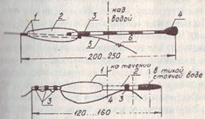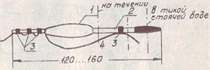 Рис. 4. Перьевой поплавок с пенопластовой насадкой: 1 — пенопластовая насадка; 2 — перо; 3 — колечки из кембрика; 4 — леска; штрихпунктиром показана огрузка Вообще же существует превеликое множество разновидностей поплавков. Некоторые из них показаны на рис. 5.