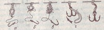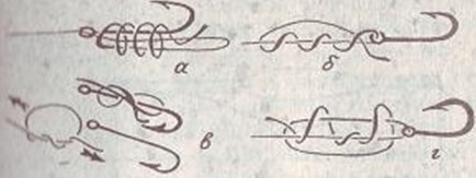 Рис. 2. Привязывание поводков: а — «петля в петлю»; б — съемный поводок; в — «глухая» привязка; г — «петля в петлю» через колечко крючка Леска сохраняется дольше, если растянуть ее и протереть ваткой, смоченной в бензине. После этого она блестит, как новая, и на ней исчезают продольные перекручивания.