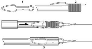 Рис. 5. Огрузка поплавка в домашних условиях В ветреную погоду, когда рыба берет лежащую на дне приманку, целесообразно основное грузило сдвинуть к подпаску. А бывает и так, что оба грузила нужно поднять ближе к поплавку, например, при ловле на медленно погружающуюся приманку. Поводок длиной 10–20 см крепится к основной леске способом «петля в петлю». Необходимо иметь при себе набор готовых оснасток для различных условий и с учетом вида рыб, которых вы собираетесь ловить. Хранят оснастки на специальных пластмассовых мотовильцах, начиная наматывать леску от крючка (рис. 6).