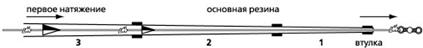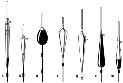 Рис. 1. Крепление основной лески к маховому удилищу, имеющему цельный кончик, с помощью застежки из сталистой проволоки: 1 – застежка; 2 – намотка на водостойком клее; 3 – кембрик Верхние колена маховых удилищ могут быть цельными, полыми или комбинированными. На мой взгляд, при ловле с глухой оснасткой практичнее и прочнее удилище, когда цельный кончик длиной примерно 40–45 см вклеен в верхнее колено. Диаметр такого кончика в самой тонкой части не превышает 1,2 мм. Оснастка к вершинке удилища крепится чаще всего с помощью застежки из сталистой нержавеющей проволоки (рис. 1) или пластикового коннектора. При полой вершинке возможен вариант крепления посредством внутреннего амортизатора, который проходит через все удилище (рис. 2). Главный недостаток такого крепления – не всегда качественная подсечка. Рис. 2. Резиновый амортизатор с двойным натяжением: 1, 2, 3 – соответственно колена махового удилища с полой вершинкой Некоторые рыболовы-любители при монтаже оснасток не придают должного значения конструкции поплавка и его правильной, наиболее рациональной огрузке. В результате большинство осторожных поклевок остаются незамеченными, часто удильщик подсекает впустую. Качественно изготовленный поплавок имеет максимальную грузоподъемность при минимальных размерах, он чувствителен при поклевке, хорошо виден на воде, легко перемещается по леске. А главное – сохраняет вертикальное положение при любых манипуляциях со снастью во время проводки. Такие поплавки выпускают многие зарубежные фирмы, можно их изготавливать и самостоятельно – было бы желание. В качестве материала лучше всего подходят бальса и мелкопористый твердый пенопласт. Перед покраской поплавки покрываются эпоксидным клеем. Современный поплавок для глухой оснастки представляет собой четыре элемента: тело, антенна, колечко для пропуска лески и киль. Форма и размеры поплавка могут быть самыми различными (рис. 3), а вот выбор поплавка зависит от условий ловли. Например, при ловле в тиховодье, без ветра, наиболее чувствительным будет поплавок в виде иглы (иногда его называют «перьевым»). За счет того, что у него минимальное лобовое сопротивление, он прекрасно реагирует на поклевку как на всплытие, так и на утапливание. Рис. 3. Различные виды поплавков: а – для ловли в стоячей воде и при безветрии; б– на мелководье; в – на большой волне и на течении; г – наиболее универсальный; д, е – для более тяжелой оснастки; ж – для облегченной оснастки Вместе с тем условия ловли бывают таковы, что приходится применять поплавки, имеющие большее лобовое сопротивление при поклевке. От чего это зависит? На течении, к примеру, устойчивее ведет себя поплавок, у которого высокий центр массы и больше площадь поверхности, чем у «иглы». При достаточно длинном киле (от 5 см и больше) такой поплавок хорошо работает на волне и на достаточно сильном течении во время проводки. Поплавки же с цилиндрическим или иглообразным телом в таких ситуациях накреняются, ложатся на бок и вообще ведут себя непредсказуемо. В глухой оснастке поплавок имеет обычно две-три точки крепления, на основной леске два вида грузил: основное и подпасок либо набор дробин из мягкого свинца. Основное грузило уравновешивает большую часть тела поплавка, а подпасок притапливает поплавок так, что из воды выступает кончик антенны всего на 1