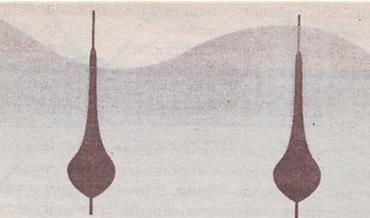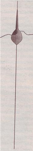 Рис 6 Максимально устойчивый поплавок При отсутствии внешних воздействий (ветра, волнения, течения), можно пользоваться поплавком максимальной чувствительности — «иглой». А в случае максимального внешнего воздействия необходимо выбирать поплавок с максимальной устойчивостью. Новичку может показаться: «Если взять поплавок с максимальной чувствительностью, то можно ловить в любой погодной и гидрологической ситуации. Пусть поплавок будет неустойчив. Ведь он чувствительный, следовательно, поклевку он будет регистрировать лучше, чем поплавок устойчивый, но с меньшей чувствительностью». На самом деле это совершенно не верно. Чувствительный поплавок в плохих условиях будет вести себя так, что поклевку по нему определить будет практически невозможно. Поплавки с тонкой длинной верхней частью, даже при небольшой волне, хотя и занимают необходимое вертикальное положение, но постоянно вылезают из воды, тем самым мешая определить поклевку. Поплавок то ныряет, то показывается над водой на — очень большую высоту. На схеме (рис. 7) показано поведение такого поплавка при волнении. Хотя на рисунке поведение поплавка сильно утрировано (тело поплавка все же совершает компенсационные движения «вверх — вниз»), использовать такой поплавок при волнении нельзя, хотя для поклевок «на подъем» он подходит идеально.
