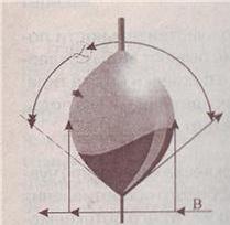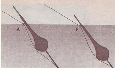 Рис. 9. Компенсационные перемещения шаровидного поплавка на волне Теперь, когда мы немного разобрались с воздействием волны на поплавки, пора перейти к влиянию течения. Воздействие на поплавок течения примерно такое же, как и притормаживание лесой при осуществлении проводки. И опять наиболее чувствительные поплавки нам не подходят. Тонкие удлиненные поплавки вылезают из воды и сильно наклоняются. Даже пузатые шаровидные поплавки выходят из вертикального положения. А для шаровидных поплавков это крайне нежелательно, так как получается эффект, показанный на схеме (рис. 10). Как вы видите, над водой оказывается та часть поплавка, которой там быть не должно. Частично избежать такого эффекта можно, удлинив киль поплавка или, что еще более эффективно, подняв лесопропускное колечко (место его установки) как можно ближе к антенне поплавка. Удлинение киля препятствует сильному наклону поплавка, а близкое к антенне расположение колечка не даст поплавку высовываться из воды в вертикальном направлении. Если раньше на поплавках колечко устанавливалось достаточно низко, то практически на всех видах современных поплавков колечко устанавливается вплотную к антенне.