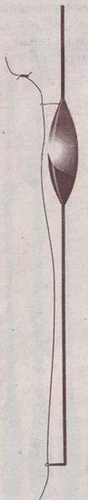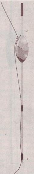 Рис. 12. Поплавки, обладающие наибольшей чувствительностью Поплавки для снасти дальнего забросаМы уже поговорили о поплавках для махового удилища и «штекера», разобрали их форму, принцип изготовления. Теперь пора поговорить о поплавках для удилищ с катушкой. Поплавки этого типа делятся на три вида: 1. Поплавок с двумя точками крепления, «глухой». Это поплавок точно такой же, как и для махового удилища. 2. Поплавок с двумя точками крепления, скользящий. Форма поплавка примерно такая же, как и для махового удилища, но верхнее колечко вынесено за пределы тела поплавка и, кроме того, существует нижнее колечко, которое устанавливается на нижнем конце киля. 3. Поплавки с одной точкой крепления. Эти поплавки не похожи на привычные нам, они очень длинные и напоминают стрелу (или дротик) с утяжеленным наконечником (рис. 13). Рис. 13. Поплавки с одной точкой крепления Теперь поподробнее о каждом. «Глухие» поплавкиКак я уже сказал, первый вариант полностью идентичен тому, что описывался в предыдущей главе. Разве что грузоподъемность таких поплавков может потребоваться несколько большей, чем при стандартной ловле. Эти поплавки, совместно со снастью дальнего заброса, используются для ловли на течении (даже на очень быстром) при большой глубине, что обуславливает несколько больший размер (грузоподъемность) поплавков (рис. 14). Рис. 14. «Глухой» поплавок с двумя точками крепления Поскольку дальность заброса может быть значительная, то и антенка должна быть достаточно толстой (до 3 миллиметров). Но не надо, приходя в магазин, выбирать поплавки с набалдашниками на антенке или антенки длиной, превосходящей длину поплавка. Яркую антенку, диаметром 3 миллиметра, легко различить с расстояния до 50 метров. Поскольку нагрузка на поплавок, в случае его использования для снасти дальнего заброса, возрастает, то иногда происходят протирания тела поплавка лесой. Также этому способствует крупная рыба, для ловли которой и предназначена данная снасть. Есть, правда, вариант таких поплавков, которые лишены этого недостатка. Вместо верхнего колечка в тело поплавка вклеена трубочка, проходящая параллельно оси поплавка от места крепления колечка до точки выхода киля. При использовании подобной конструкции леска не изгибается и не давит на тело поплавка. К сожалению, такой поплавок имеет немного меньшую грузоподъемность, а изготовить его самостоятельно слишком сложно в технологическом отношении. Следует добавить, что, собирая оснастку для дальнего заброса с такими поплавками, необходимо надеть на киль не один, а 3–4 «кембрика», так как при недостаточно прочном креплении глубина спуска часто смещается в ту или иную сторону (резкий заброс, мощная подсечка). Скользящие поплавки с двумя точками крепленияПо форме очень близки к первому типу. Чаще всего они более вытянуты и имеют несколько меньший киль, что, в принципе, ничем не обусловлено. Общее устройство таково: обычный поплавок с длинным килем, вместо верхнего маленького колечка крепится колечко на длинной ножке, дабы вывести лесу за пределы тела поплавка (рис. 15). Леса не должна иметь с телом поплавка никакого контакта. Для этого нижнее колечко не просто крепится на киле, а устанавливается на ножке, длина которой чуть превышает радиус поплавка. Как верхнее, так и нижнее колечко (особенно верхнее) должны быть очень маленьк