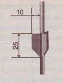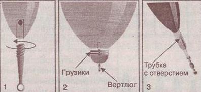 Рис. 18. поплавки со сменным телом Еще одной отличительной особенностью поплавков с одной точкой крепления является то, что в их тело может быть заложен определенный груз, о чем мы уже вкратце говорили. Груз этот может быть как постоянным, так и переменным. Такая конструкция позволяет увеличивать или уменьшать огрузку на лесе, делая снасть медленнее или быстрее опускающейся. Упомянутый груз обычно выполнен в виде металлических шайб, насаживаемых на резьбовой киль поплавка. Обычно набор из 4–5 шайб имеет общий вес 1–3 грамма. Допустим, на вашем поплавке имеются 4 одинаковые шайбы общим весом 2 грамма (об этом вы узнаете из надписи на поплавке). Следовательно, снимая одну шайбу, вы должны добавить на лесу груз (дробинку) весом 0,5 грамма. В самодельных поплавках вместо шайб используются стандартные свинцовые дробинки, которые закладываются во вклеенную металлическую трубочку (куда ввинчивается киль). Для чего же нам подгружать поплавок? Ведь можно поставить сразу весь требуемый груз на лесу. Но это далеко не так. Представьте ситуацию, когда точка ловли удалена от берега на 30–40 метров, а глубина в данной точке не превышает 2 метров — типичная ситуация для ловли в озерах и на плесах больших рек. Поплавок тут нужен тяжелый — не менее 10 граммов весом, чтобы забросить его на такое расстояние. Но ловить с соответствующей такому весу поплавка огрузкой на мели — это заранее испортить себе рыбалку. Поэтому мы ставим 8 граммов в поплавок, а остальные 2 грамма — на лесу. В процессе заброса, особенно если он дальний, поплавок начинает вращаться — его киль имеет дугообразную траекторию полета, а кончик антенки — тоже дугообразную, но, так как он не связан напрямую с лесой, то еще и вращается вокруг нее по спирали. Тем самым леса, находящаяся на оснастке ниже поплавка, начинает наматываться на антенку, что приводит к частым запутываниям. Этого удается избежать, установив на антенку, чуть ниже ватерлинии (линии огрузки), оперение, как у стрелы (рис. 19). Обычно оперение имеет 3 лопасти в виде усеченной трапеции с основанием, примыкающим к антенке. Размер оперения примерно такой, как показано на рисунке. Оперение выполняется из лавсана или любого другого подходящего по свойствам пластика и вклеивается в антенку. Подобный стабилизатор имеет смысл устанавливать на поплавки с грузоподъемностью (общей) более 5–6 граммов, то есть на те поплавки, которые вы собираетесь использовать для ловли на дальних дистанциях.