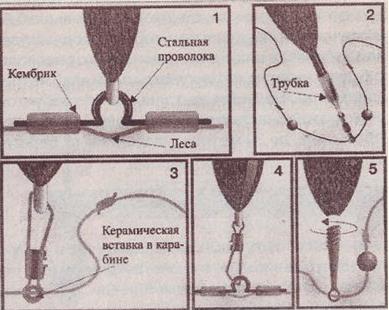 Рис. 16. Виды крепежа поплавка с одной точкой крепления: Поплавок описываемого типа состоит из тела, киля и антенки как, впрочем, и все другие поплавки. Отличием же является соотношение параметров этих составных частей. Тело поплавка изготавливается из тех же материалов, что и у обычного поплавка. Форма его может быть совершенно различной, но принципиальной роли она не играет. Как правило, это «удлиненная капля» — «веретено». Делать у подобного поплавка заниженный центр тяжести не имеет смысла, так как тело и так погружено под воду на глубину от 20 до 30 сантиметров и лишний сантиметр тут роли не играет. Занижая же центр тяжести, мы, тем самым, увеличиваем лобовое сопротивление поплавка, что плохо сказывается на его чувствительности. Антенка у этого поплавка весьма оригинальная. Ее диаметр обычно около 3–5 миллиметров, а длина может доходить до 40 сантиметров, хотя обычно составляет 20–30 сантиметров. Но не подумайте, что вся эта конструкция торчит из воды. Нет. Поплавок огружается так, чтобы из воды торчала только часть антенки — 2–5 сантиметров. Этого вполне достаточно для регистрации любой поклевки. Соответственно и окраска антенки делается таким образом, что яркой является только верхняя ее часть (те 2–5 сантиметров), а все остальное — под цвет тела поплавка (как правило, черный, зеленый, синий). Материал для изготовления антенок может быть различным: куга (тростник), бальза, павлинье перо, пластиковая трубочка. Особой роли это не играет, главное, чтобы не страдала грузоподъемность. Существует несколько конструкций киля поплавка (рис. 17). В нижней части поплавка устанавливается металлический киль, который ввинчивается в металлическую же трубку с резьбой, вклеенную в тело поплавка. Трубку можно оснастить дополнительной огрузкой (просто вложив внутрь несколько грузиков). В киле имеется отверстие для установки на леску или с той же целью вклеен вертлюжок. Отверстие должно быть тщательно отшлифовано. Такая конструкция позволяет заменять поплавок на более тяжелый или более легкий, не снимая с лески огрузки. Вы отвинчиваете поплавок от киля и привинчиваете другой, в который предварительно заложен необходимый груз. Подобные поплавки могут иметь грузоподъемность (требуемую огрузку) от 0,5 до 4–5 граммов, а забросить их на большое расстояние позволяет их собственный вес. В магазинах редко встретишь поплавки с отвинчивающимся килем, но их можно изготовить самостоятельно.