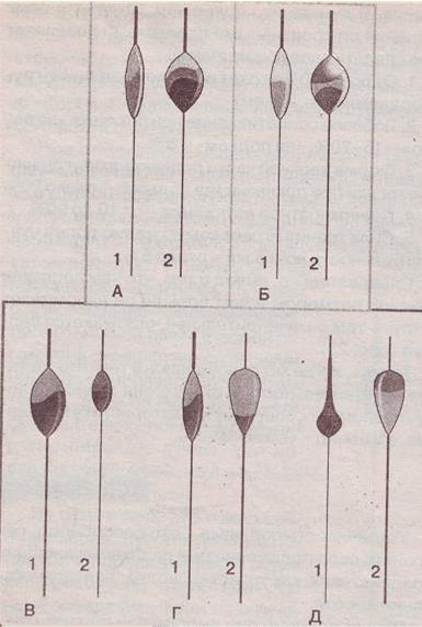 Рис. 4. Поплавок А заметить верхней части легче, чем поплавок Б Из всего вышесказанного следует, что чем тоньше будет верхушка поплавка, то бишь его часть, которая огружается «подпаском», тем поплавок будет более чувствительным к поклевке «на подъем». Чувствительность к этому типу поклевки зависит и от грузоподъемности (инерции) поплавка. Также она зависит и от площади поверхности и лобового сопротивления поплавка, но в меньшей степени, чем при поклевке «на потоп». Меньшая степень зависимости от этих факторов (площадь поверхности и лобовое сопротивление) объясняется меньшей скоростью всплытия поплавка, в отличие от скорости погружения. И при том, и при другом типах поклевки чувствительность зависит от силы поверхностного натяжения воды. На границе перехода тела поплавка из водной среды в воздушную образуется водяной мениск (за счет несмачиваемости поверхности поплавка), который мешает как погружению, так и всплытию поплавка. Вышеуказанная сила будет тем меньше, чем меньше будет диаметр тела поплавка в сечении по уровню воды. То есть, чем верхняя часть поплавка тоньше, тем меньше эта сила и тем чувствительнее поплавок. Из всего, что было сказано о чувствительности поплавков, можно сделать вывод: если не брать в расчет силу трения воды о поверхность поплавка, то при любых обстоятельствах, чем поплавок тоньше, чем он больше напоминает «иглу», чем меньше у него максимальный диаметр, тем он чувствительнее. Процентное соотношение сил, влияющих на чувствительность, определяется весьма трудно. Оно зависит от множества факторов (температура воды, скорость поклевки и прочее). Знания по этому поводу относятся к области гидродинамики при малых скоростях и к области гидростатики. Проводить подобные исследования на этих страницах не имеет смысла, поэтому я остановлюсь только на ориентировочных, полученных из опыта, заключениях, не претендующих на научные изыскания. Я думаю, что более чем 10-летний опыт общения со спортивными поплавками позволяет мне сделать следующие выводы: 1. От 60 до 70 % играет роль сила инерции (грузоподъемность, объем). 2. Лобовое сопротивление при поклевке «на потоп» — 15–20 %, «на подъем» — 5 %. 3. Форма верхней части поплавка имеет значение только при поклевке «на подъем» — около 20% 4. Поверхностное натяжение — от 10 до 20 %. 5. Сила трения играет самую малую роль в чувствительности поплавка — около 5 %. Следовательно, вывод о том, что чем поплавок меньше размером и чем больше он напоминает «иглу» — тем он чувствительнее, оказывается верным (рис. 5). Рис. 5. Сравнение поплавков разных форм по чувствительности: А — при поклевке «на потоп» лобовое сопротивление у поплавка 1 меньше, чем у поплавка 2. Поплавок 1 чувствительнее; Б — если поплавок 1 равен по объему поплавку 2, то у поплавка 1 площадь поверхности, а следовательно, и сила трения, будет больше, чем у поплавка 2. Поплавок 2 чувствительнее; В — инертность (грузоподъемность) у поплавка 2 будет меньше, чем у поплавка 1. Поплавок 2 чувствительнее; Г — при поклевке «на подъем» лобовое сопротивление у поплавка 1 меньше, чем у поплавка 2. Поплавок 1 чувствительнее; Д-при поклевке «на подъем» поплавок 1 всплывает выше, чем поплавок 2. Поплавок 1 чувствительнее Теперь, когда мы разобрались в том, что же такое чувствительность и от чего она зависит, следует вспомнить еще одну характеристику попла