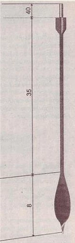 Рис. 19. Размеры стабилизационного оперения поплавка с одной точкой крепления Кроме того, оперение помогает вам лучше зафиксировать поклевку «на подъем». Заметить стабилизатор черного цвета, появившийся из-под воды, не составляет труда даже с расстояния в 60–70 метров. При установке оперения обращайте внимание на то, что в месте установки могут образоваться трещины, которые следует тщательно обработать эпоксидной смолой или другим водостойким клеем. • (8 + 2) + 1 — означает, что вес поплавка 8 граммов, вес изменяемой внутренней огрузки 2 грамма, а груз, устанавливаемый на лесу, — 1 грамм. • (10 + 4 x 0,2) + 2-означает, что вес поплавка 10 граммов, внутренний груз состоит из 4 грузиков (шайб) по 0,2 грамма, груз, устанавливаемый на лесу, 2 грамма. • 4 + 3 — означает, что вес поплавка 4 грамма, груз на лесе 3 грамма. Все достаточно просто. Общую конструкцию поплавка вы можете видеть на рисунке 20. Рис. 20. Общий вид и ориентировочные параметры поплавка с одной точкой крепления (М. Балачевцев) | |